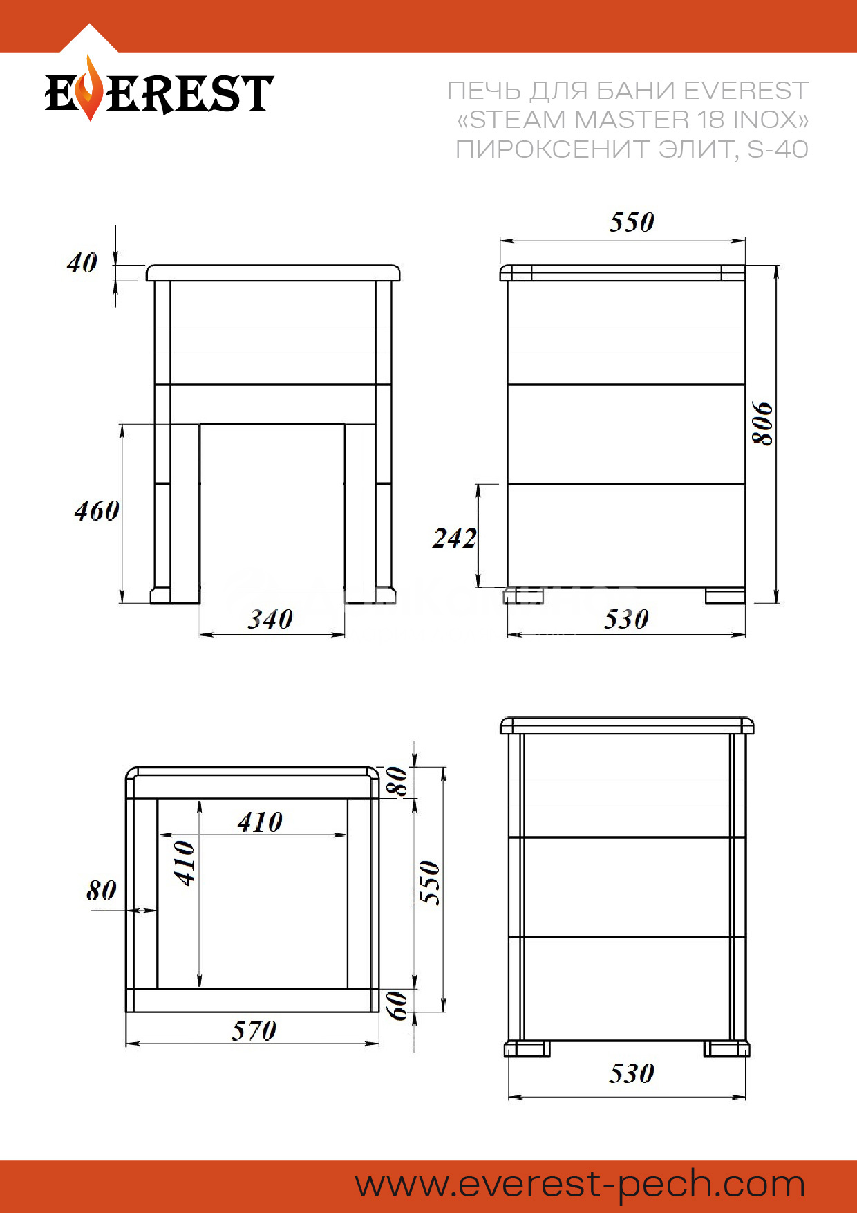 Печь для бани Эверест "Steam Master 18 INOX" Пироксенит Элит, S-40 изготовлена из нержавеющей стали. Печь предназначена для установки в частные и коммерческие бани с объёмами парных помещений до 18 м³.