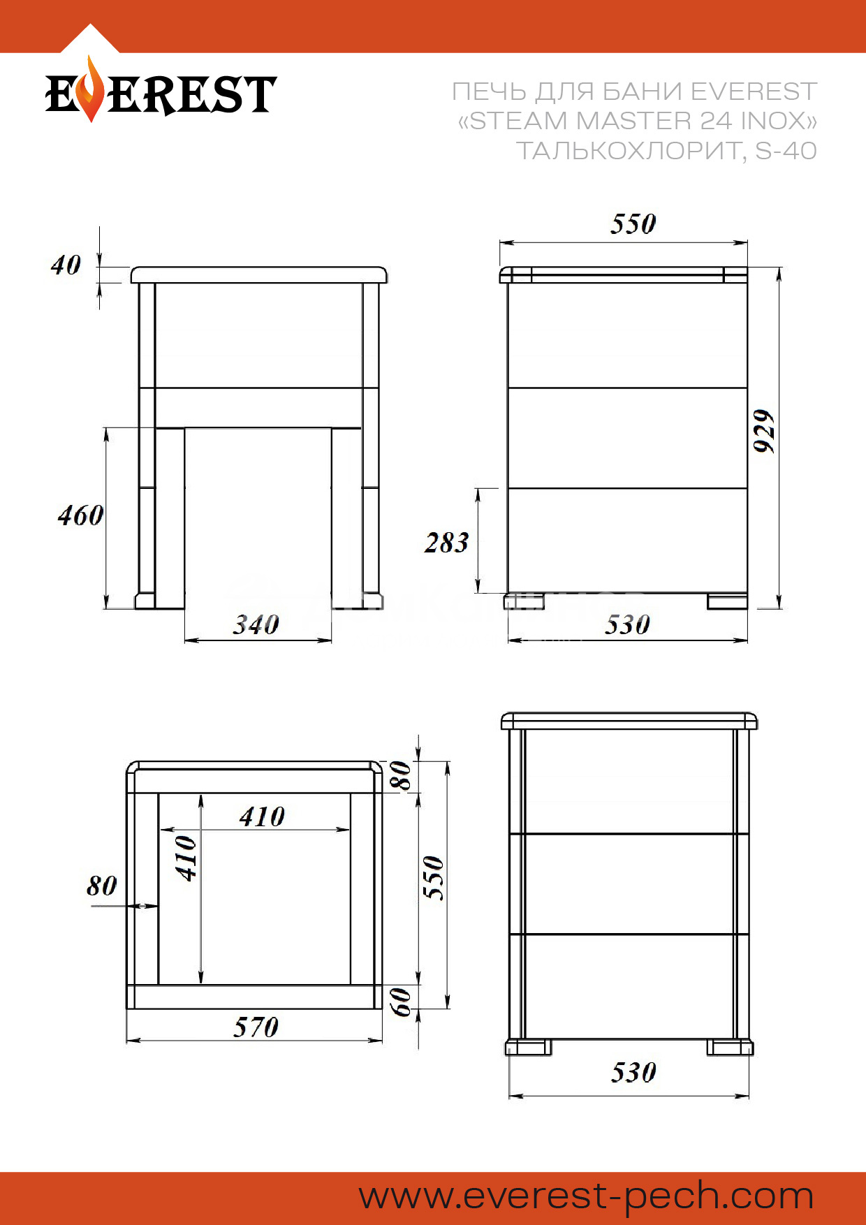Печь для бани Эверест "Steam Master 24 INOX" Талькохлорит, S-40 изготовлена из нержавеющей стали. Печь предназначена для установки в частные и коммерческие бани с объёмами парных помещений до 24 м³.