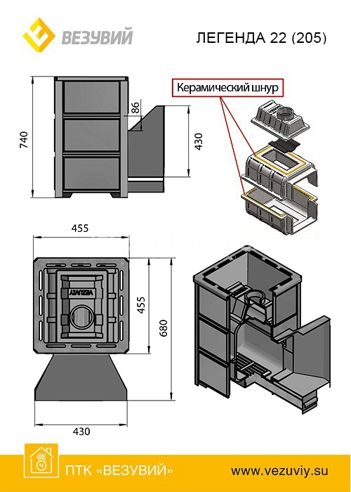 Преимущество печи в том, что топка печи состоит из 3-х ЧУГУННЫХ элементов. На стыке между ними используется керамический шнур с рабочей температурой 1200 градусов. То есть топка печи абсолютно герметична! Для фиксации деталей между собой применяется болтовое соединение, что даёт 100% гарантию безопасности при эксплуатации.