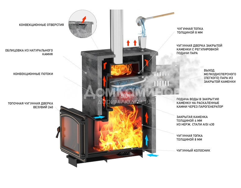В данном комплекте пар можно получить двумя способами: можно поддавать воду в закрытую каменку печи через специальную лейку, либо поддать воду на камни через дверцу, которая идет в комплекте.