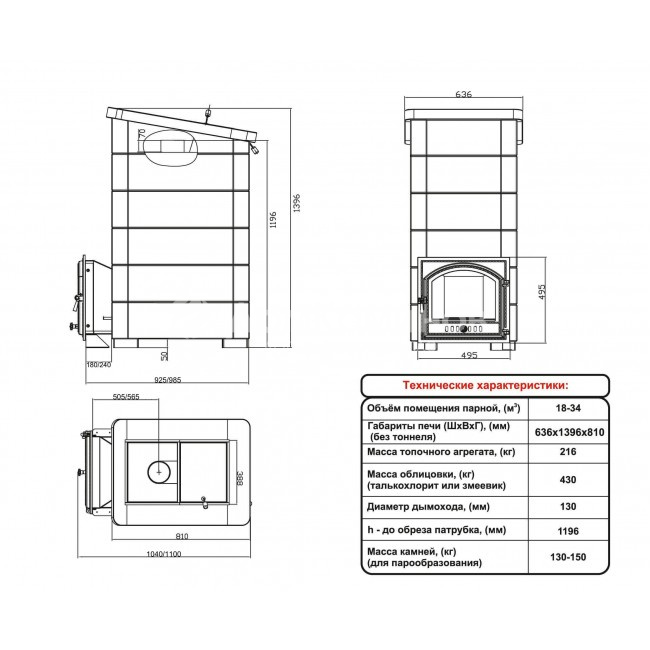 По желанию печь комплектуется «Паровой пушкой» для получения пара, в том числе с камней среднего и нижнего уровней. Суммарная масса печи составляет около 800 кг (топочный агрегат, облицовка, закладка камней в каменку), что обеспечивает очень высокую теплоаккумулирующую способность этой модели.