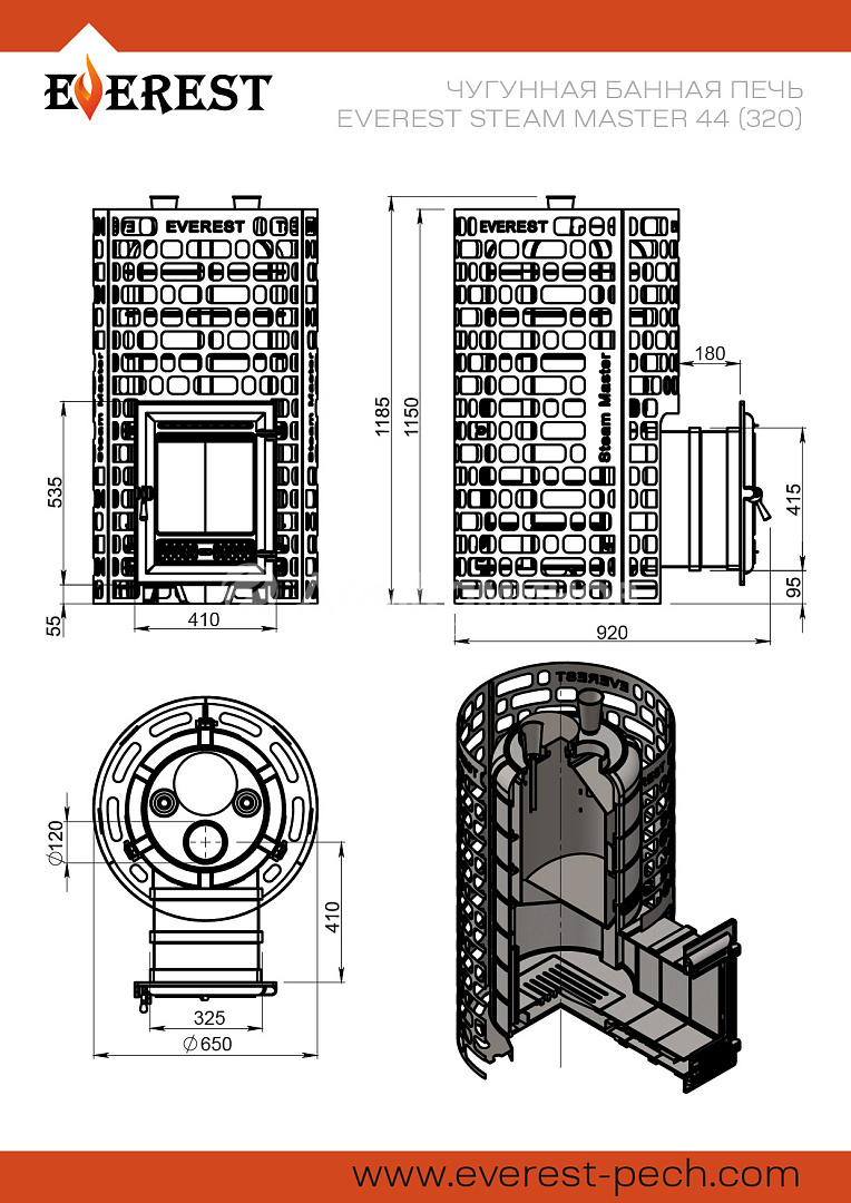 Банная печь Эверест «Steam Master» 44 (320) ЧУГУН предназначена для нагрева помещений и получения пара в парных объёмом до 44 кубических метров.