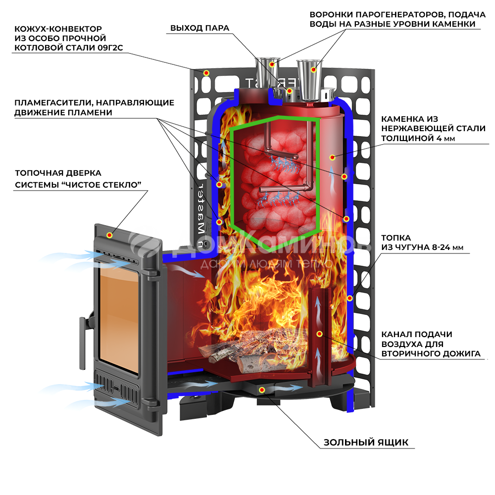 Форма каменки обеспечивает максимальное снятие энергии с горящих в топке дров. Объём каменки рассчитан на размещение до 70 кг камней для бани. Выход пара происходит через верхнюю крышку с отверстиями.