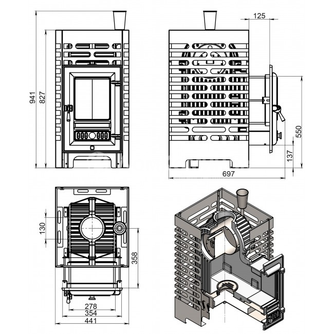 Закрытая каменка из нержавеющей стали размещена над массивной чугунной топкой. Общий вес печи составляет 80+кг, и большую часть этой массы составляет теплоемкий жаропрочный чугун. Особенная конструкция стыков полукорпусов позволяет исключить применение термошнура. Болтовое соединение М12 дополняет конструкцию обеспечивая плотное прилегание деталей и надежный контакт элементов печи между собой. Толщина чугуна на корпусе печи Астон составляет от 6 до 18 мм. 74 ребра жесткости высотой 4 мм увеличивает поверхность теплоотдачи и усиливает прочность стенок корпуса печи. Глубина топки 350 мм, её ширина 265 мм, высота 250 мм.