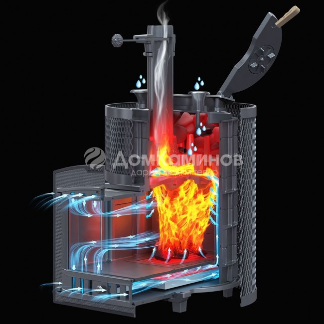 Под каменкой на 3-х упорах установлен рассекатель пламени, он разделяет пламя на 3 потока и направляет сначала на боковые части корпуса для интенсивного нагрева стенок и конвекционного нагрева воздуха в парной. Для этого на наружных поверхностях расположены конвекционные рёбра. Дальше пламя проходит через выступы к выходу в дымоход, нагревая каменку.