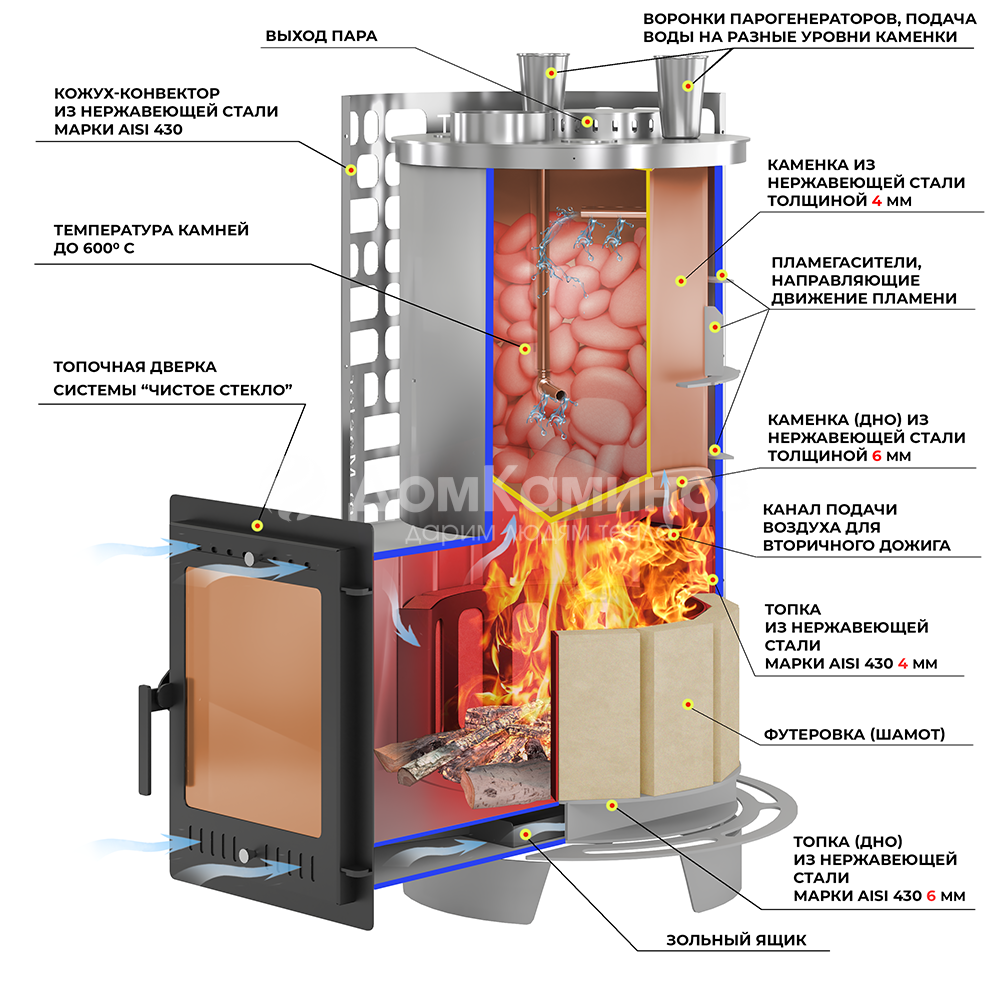 Конструкция печи включает в себя закрытую каменку из нержавеющей стали марки AISI-430 толщиной 4-6 мм, расположенную в верхней части топки. Каменка размещена прямо на пути пламени и дымовых газов, что позволяет нагреть камни до температур свыше 600 градусов по Цельсию.