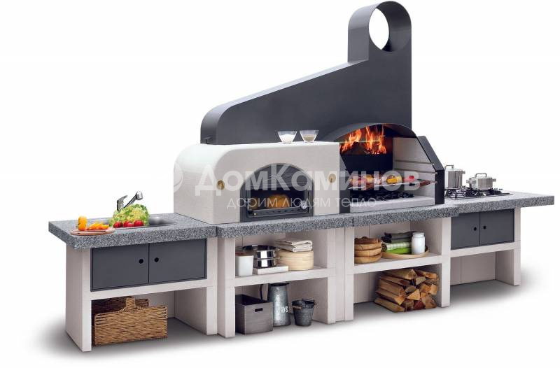Стол из серой мраморной крошки с полированной столешницей. Гриль имеет вытяжку из нержавеющей стали, окрашенную огнеустойчивой краской. Двойная огнеупорная жаровня. Стальной дымосборник, общий для гриля и духовки. Отсеки для приготовления пищи выполнены из жаростойкого материала. Снабжено решёткой для дров размером 76х40 см. Зольник оборудован системой циркуляции воздуха "fast-fire-box". Духовка выполнена из огнеупорного материала с окрашенной стальной дверцей с термометром и глазком. Для каждого модуля предусмотрены дверцы. В программу входят модуль с газовой плитой, модуль с раковиной.