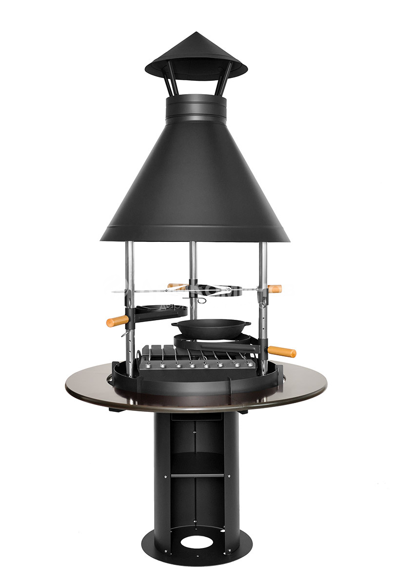 Гриль Fireline BBQ является одним из самых популярных дровяных грилей в России. Внешний вид гриля не оставляет никого равнодушным. Цвета гриля выбраны так, чтобы он не привлекал к себе слишком много внимания, оставляя эту прерогативу Вам. При этом на корпусе не будет видно следов жира, копоти и прочих попутчиков грилинга. Дровяной гриль Fireline BBQ очень надежен и долговечен. Чаша гриля и его купол выполнены из 3 миллиметровой стали, с дополнительными кольцами прочности. В совокупности эти два фактора ни при каких обстоятельствах не позволят грилю потерять форму. В нижней части гриля располагается отсек для хранения принадлежностей, а также зольник. Верхняя часть укомплектована металлическим зонтиком против дождя и прочих осадков. Гриль Lappigrill BBQ оснащен двумя независимыми, оснащенными лифтовым механизмом, платформами. Они с легкостью регулируются по высоте, что позволяет контролировать процесс жарки и готовки. На одной из них находится контактный гриль для жарки стейков. На втором чугунная сковорода, вместо которой можно установить казан. В базовой комплектации барбекю гриль Fireline BBQ оснащен: шашлычным модулем с 8 прочными шампурами из нержавеющей стали с деревянными ручками; набором для томления рыбы, состоящим из двух дощечек, выполненных из липы и ольхи, с зажимами из нержавеющей стали; чугунной сковородой, контактным грилем со съемной ручкой для жарки стейков; вертелом из нержавеющей стали; барбекю решеткой из нержавеющей стали, диаметром 72 см.; кочергой; колосником. Так же в качестве дополнительного аксессуара гриль может быть оснащен всепогодным чехлом и дополнительными трубами, с проходным элементом через крышу.