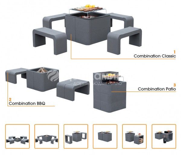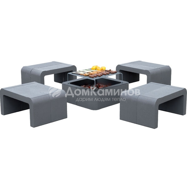 адовый комплект, выполненный в современном дизайне, состоит из барбекю и банкетки, сделанных из искусственного камня серого цвета.