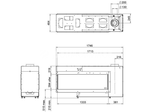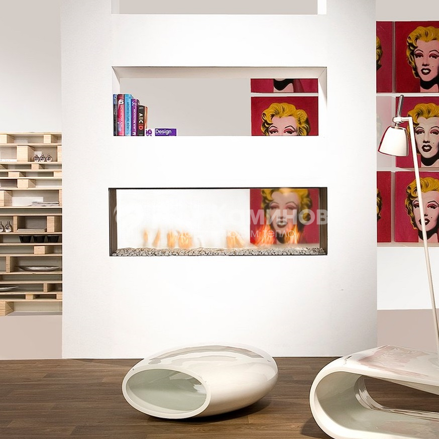 Широкий сквозной камин. Современная горелка Step Burner®. Закрытая топка. Требуется подключение к коаксиальному дымоходу.