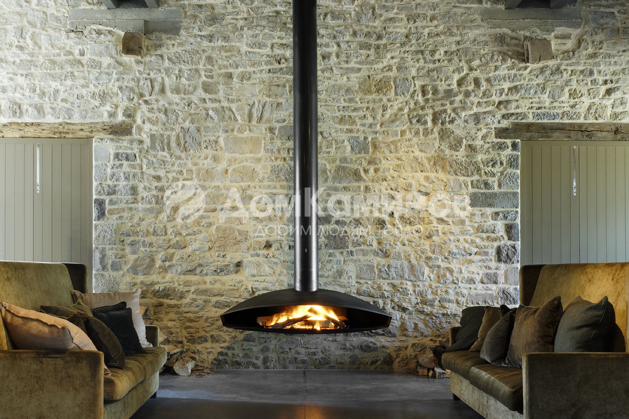 Подвесной или фиксированный у стены камин с широким отверстием (1095 мм)из стали натертой воском.