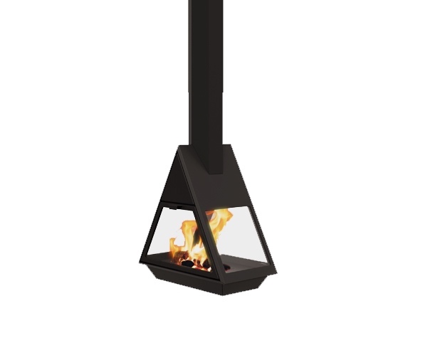 Центральный подвесной камин треугольной формы. Дымоход Ø202 мм.