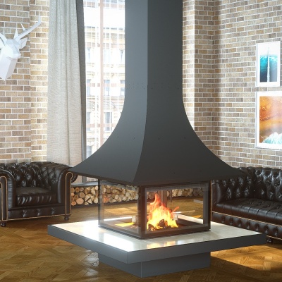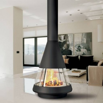 - Подвесные центральные камины. Камины, закреплённые на потолке, создают эффект "парящего" огня.