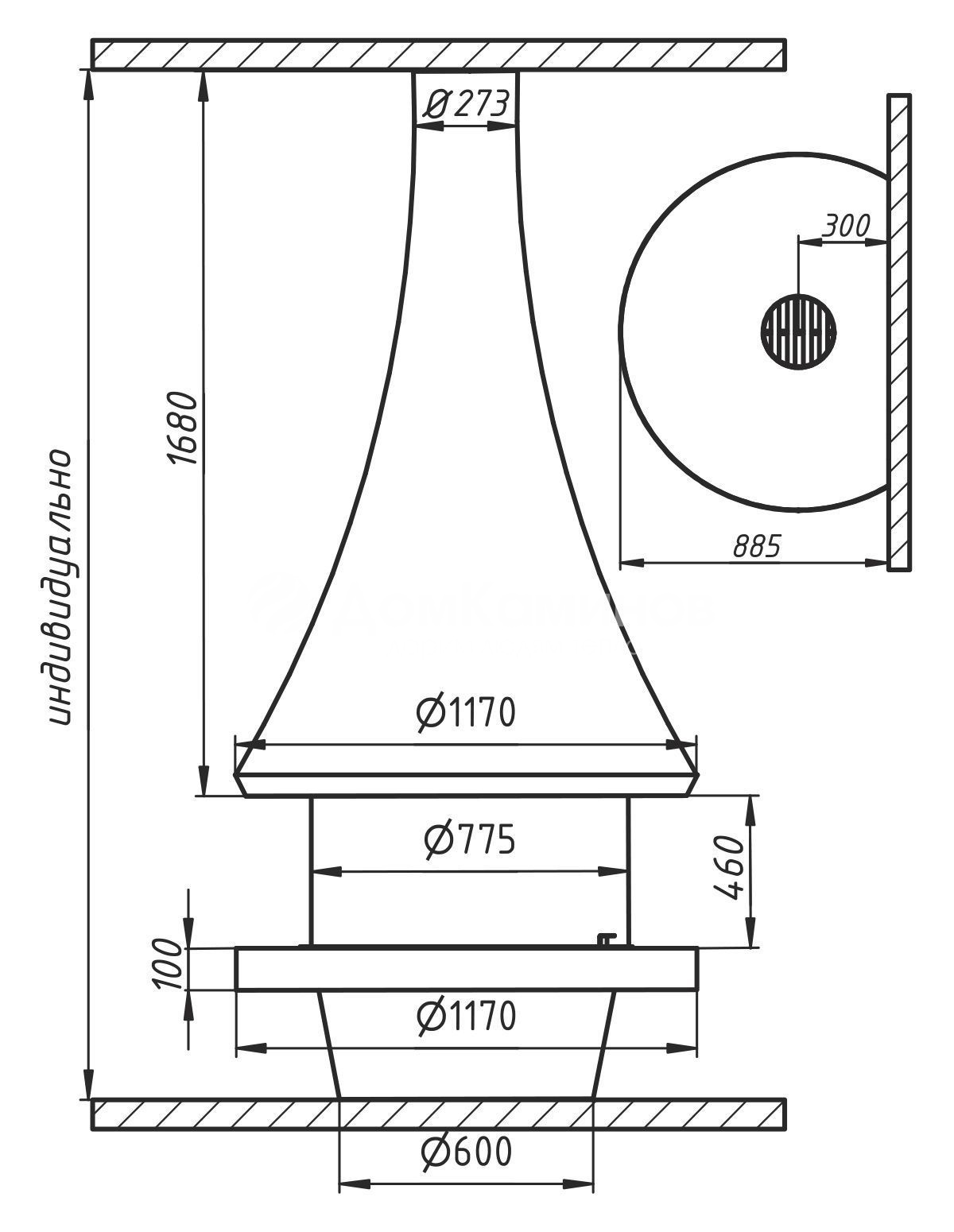 В стандартной комплектации камин рассчитан на помещение с высотой потолков 3 м. В комплектацию камина входит крепёжный элемент для прямого бетонного перекрытия. Для наклонных перекрытий из бетона или дерева необходим универсальный крепёжный элемент, который заказывается отдельно, исходя из угла наклона и материала перекрытия.