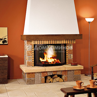Пристенный камин Auriac 97 из цветного бутового камня и камня Castillon. Балка из экзотического дерева. Кожух и банкеты на выбор.