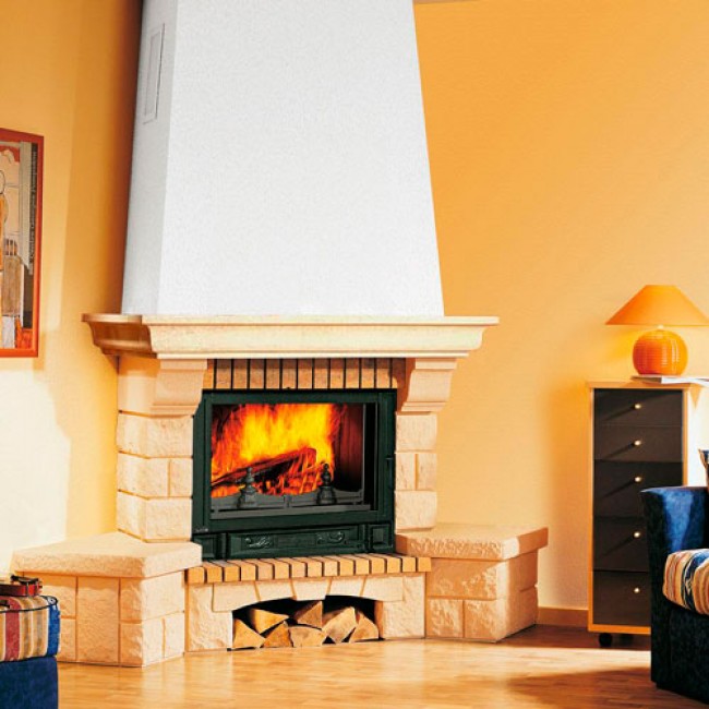 Угловой камин из желтого камня Sunrock. На снимке представлен камин с топкой F-148 C (Supra).