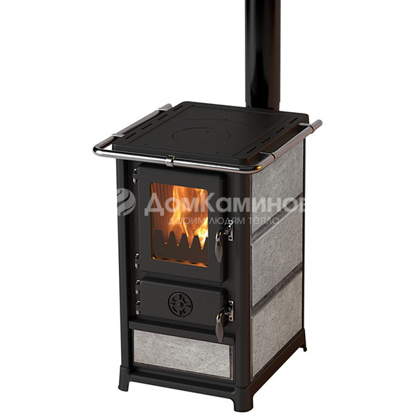 Печь укомплектована варочной поверхностью с одной конфоркой для приготовления пищи. Топочная камера состоит из чугунных плит. Дверца топки укомплектована термостойкой стеклокерамикой.