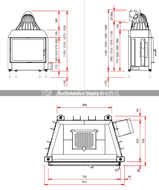 Диаметр дымохода - 200 мм.
