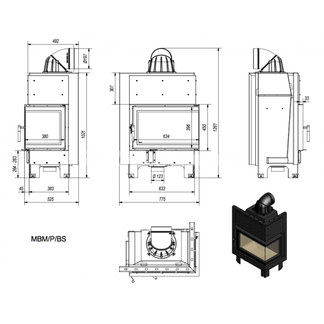 Удобная регулировка подачи воздуха в камеру сгорания. Патрубок подачи воздуха находится внизу топки, имеет цилиндрическую форму. Это дает возможность присоединения трубы 125 мм с подачей свежего воздуха с улицы или другого помещения. Топка имеет тройную систему подачи воздуха в камеру сгорания. Первичный воздух подается по всей ширине топки через щель в полосе, расположенной на передней части камина. Подача вторичного воздуха в камеру сгорания осуществляется через отверстие под задней стенкой, за счет этого получаем снижение выбросов вредных веществ в окружающую среду. Данная система дожига газов повышает эффективность топки. Третья подача воздуха — это воздушная завеса, называется системой чистого стекла. Воздух подается с помощью специальных каналов по бокам топки и равномерно распределяется на стекло по всей ширине.