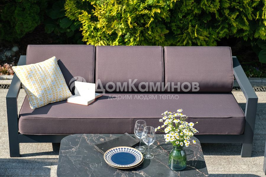 Стильный трехместный диван «Гранада» для обустройства зоны отдыха на балконе, в кафе или летней веранде. Каркас изготовлен из высокопрочного алюминия темно-серого (RAL7024) цвета.