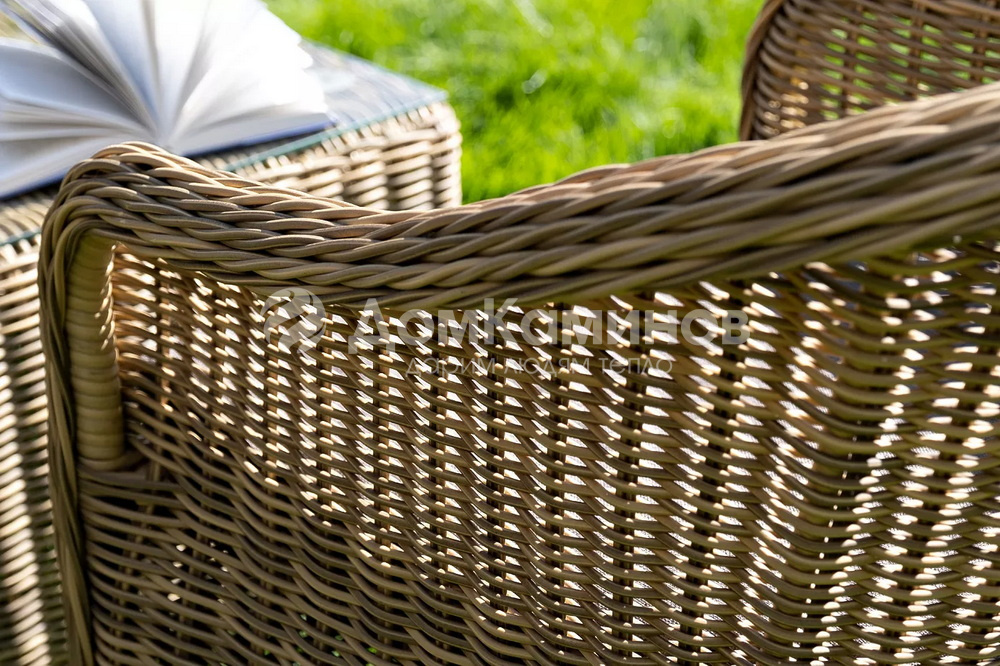 Садовый двухместный диван "Равенна" с подушками в комплекте. Диван выполнен из круглого искусственного ротанга, в основе алюминиевый каркас.Материал подушки - полиэстер 100% плотностью 230гр/м2 с влагоотталкивающей пропиткой.