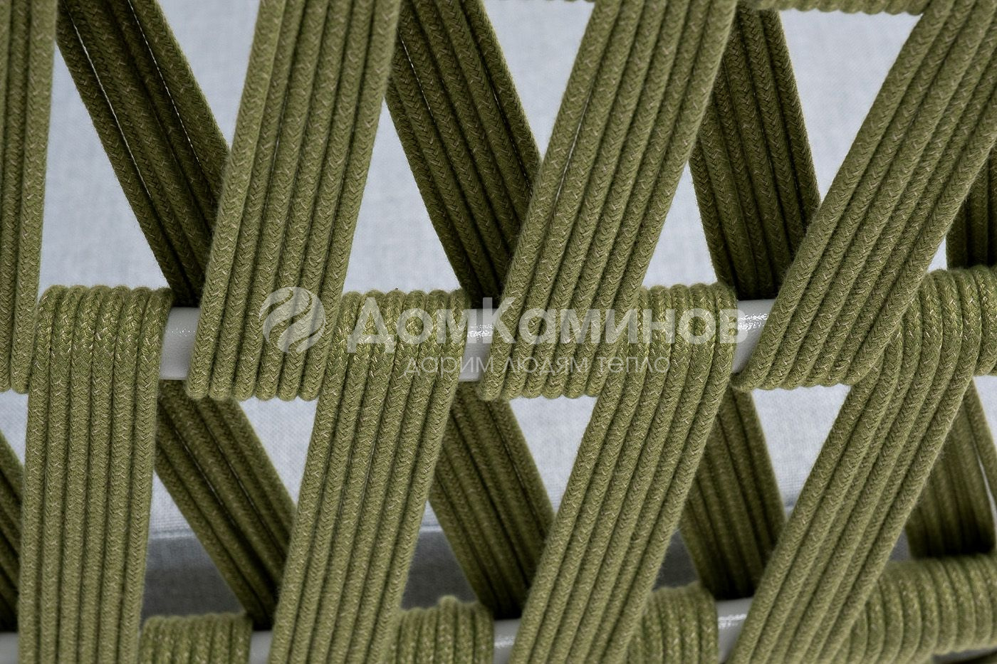 Диван имеет алюминиевый каркас, окрашенный порошковой краской в светло-серый (RAL7035) цвет. Боковины каркаса и спинка вручную оплетены роупом - эластичными синтетическими лентами, изготовленными из высокопрочных полиэфирных волокон. Цвет оплетки - салатовый меланж.