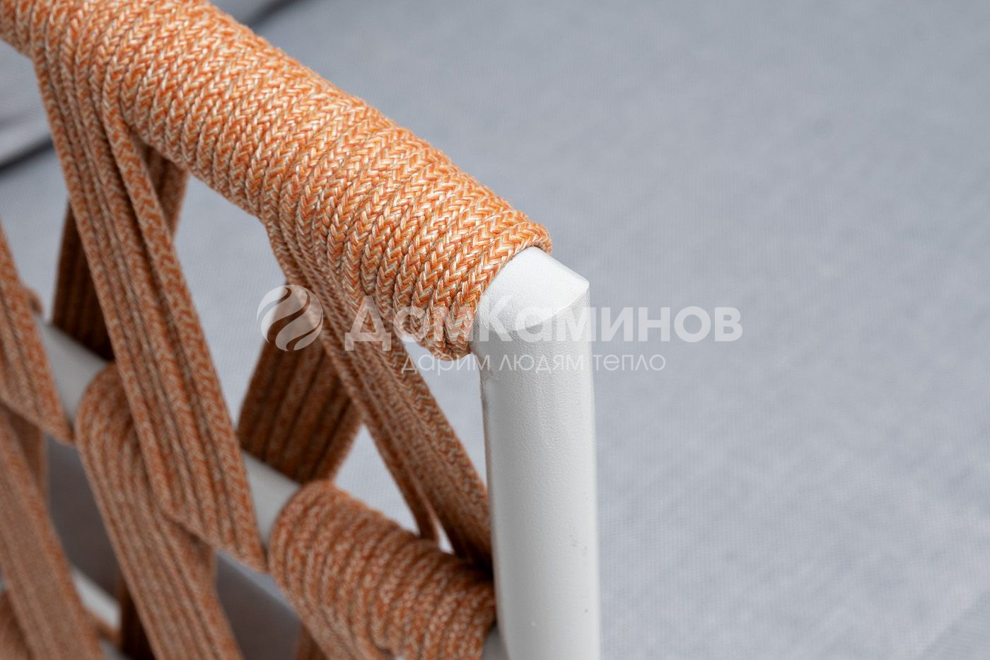 Диван имеет алюминиевый каркас, окрашенный порошковой краской в светло-серый (RAL7035) цвет. Боковины каркаса и спинка вручную оплетены роупом - эластичными синтетическими лентами, изготовленными из высокопрочных полиэфирных волокон. Цвет оплетки - оранжевый меланж.