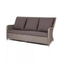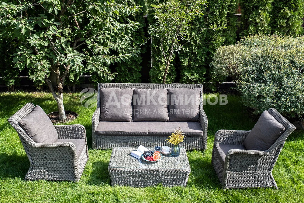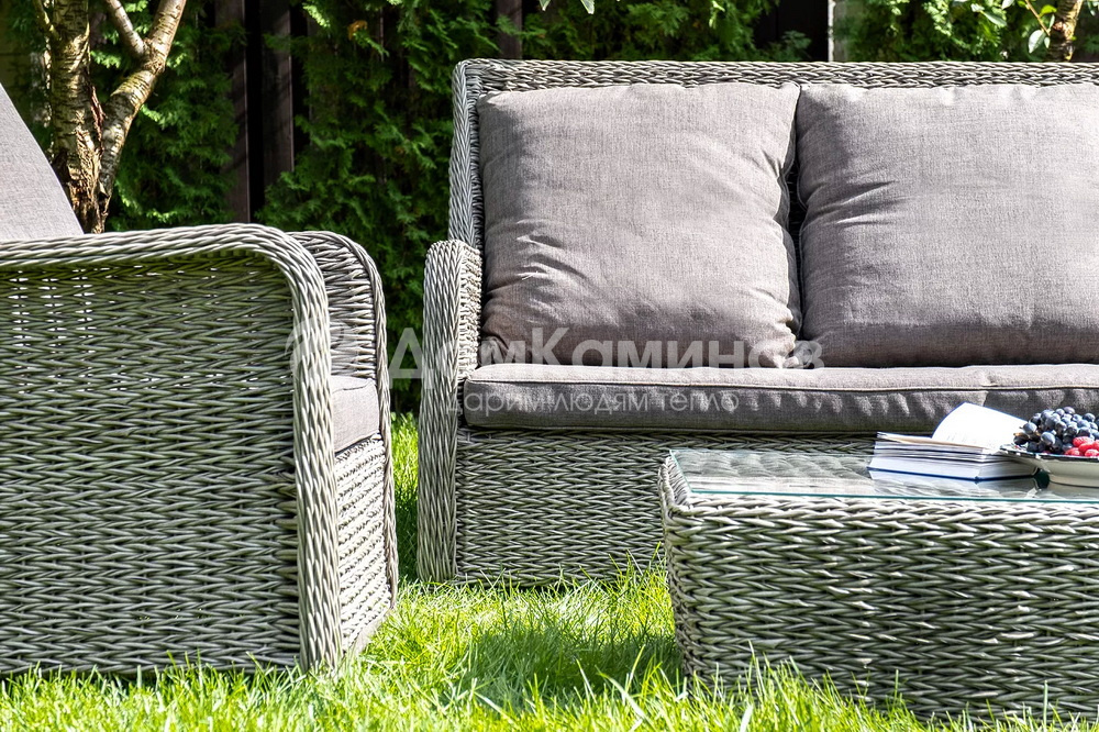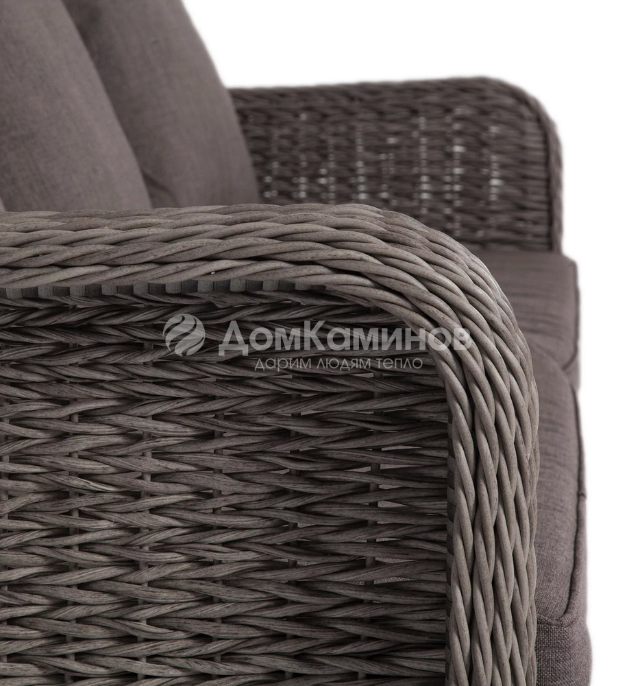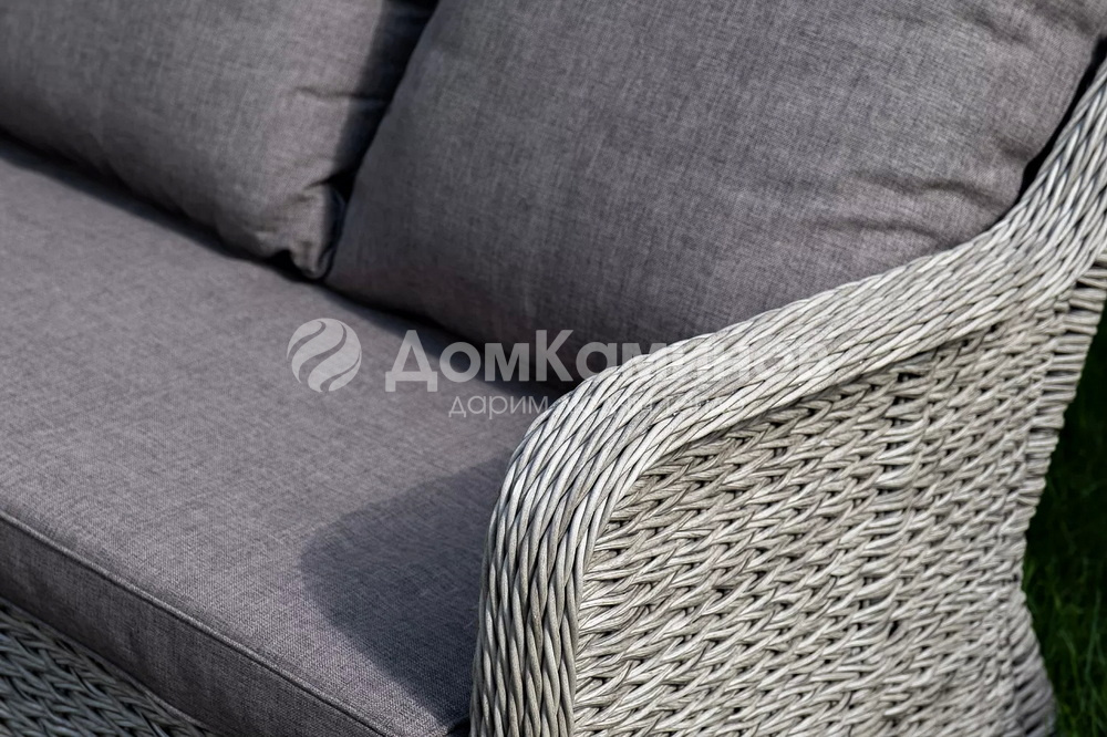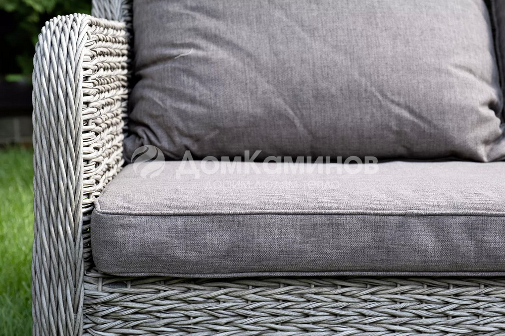Диван «Гляссе» подходит для размещения сразу трех персон. Его основа из прочного алюминиевого каркаса. Размер модели – 1900×900×980мм.Плетение из искусственного ротанга вида "гиацинт" является основным декоративным элементом мебели, цвет - графит.В комплекте с трехместным диваном идут мягкие подушки для комфортного расположения. Чехлы съемные серого цвета из высококлассного полиэстера с плотностью 230гр/м2. Защитные свойства ткани усиливаются при помощи влагоотталкивающей пропитки.