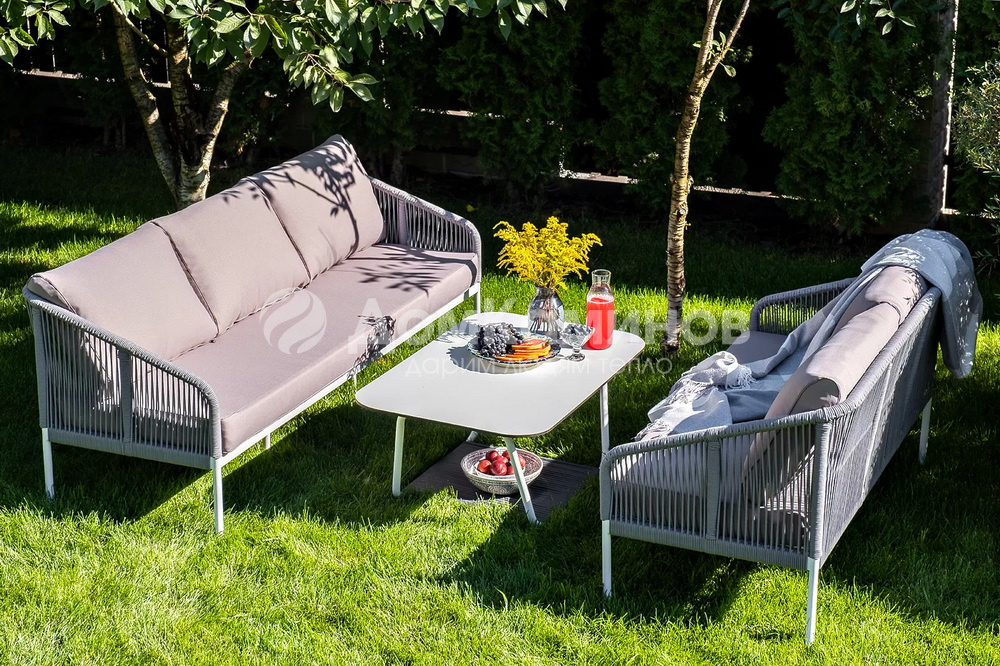 Трехместный диван "Канны" с подушками в комплекте. Диван имеет алюминиевый каркас, окрашенный порошковой краской в темно-серый цвет. Боковины каркаса вручную оплетены роупом - эластичными синтетическими лентами, изготовленными из высокопрочных полиэфирных волокон. Цвет оплетки в тон каркасу - темно-серый. Подушки состоят из наполнителя и съемных чехлов, которые обработаны влагоотталивающей пропиткой. Материал - 100% полиэстер, плотностью 230гр/м2.