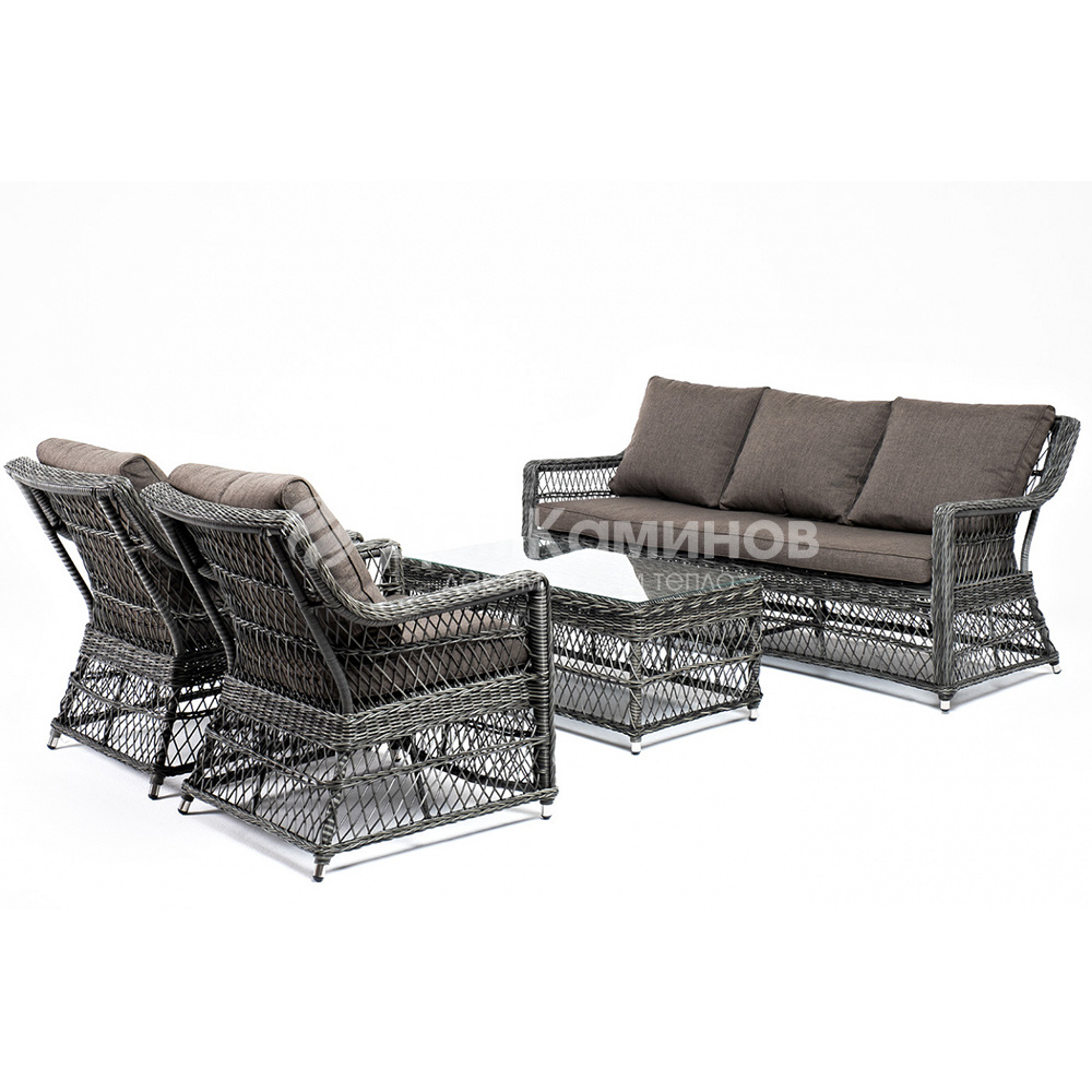 Уличная мебель имеет алюминиевый каркас с ручным плетением из искусственного ротанга в цвете "графит". Предусмотрены мягкие подушки из полиэстера серого цвета с плотностью 230гр/м2. Они имеет влагоотталкивающую пропитку. Рабочая поверхность столика изготовлена из закаленного стекла толщиной 5 мм.