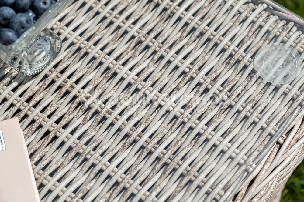 Из алюминия сделан устойчивый каркас мебели. Ее поверхность дополнена искусственным ротангом, из которого сделано ручное плетение, цвет бежевый.