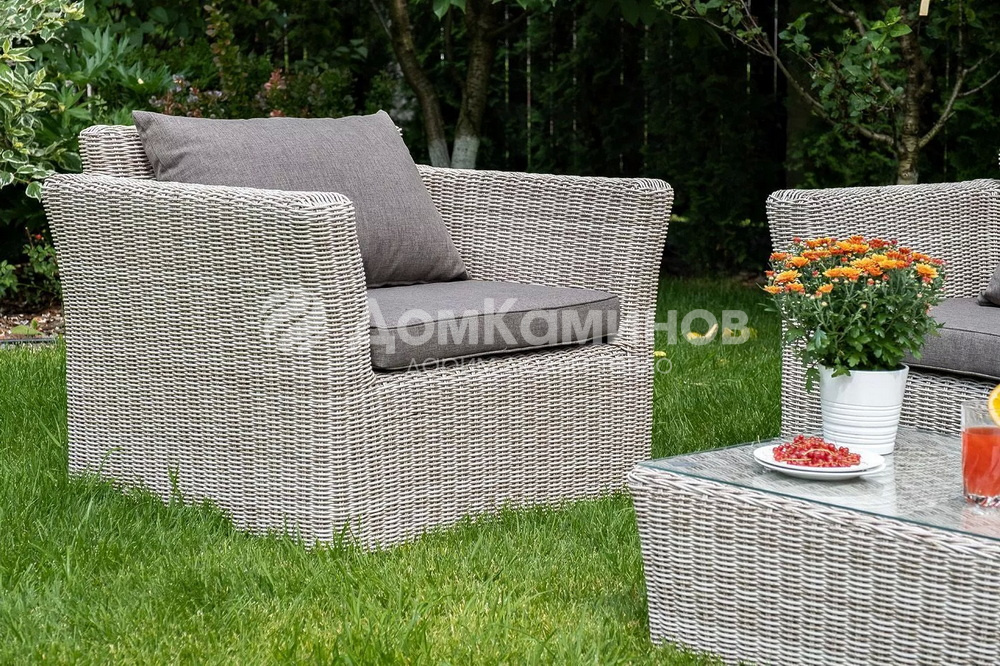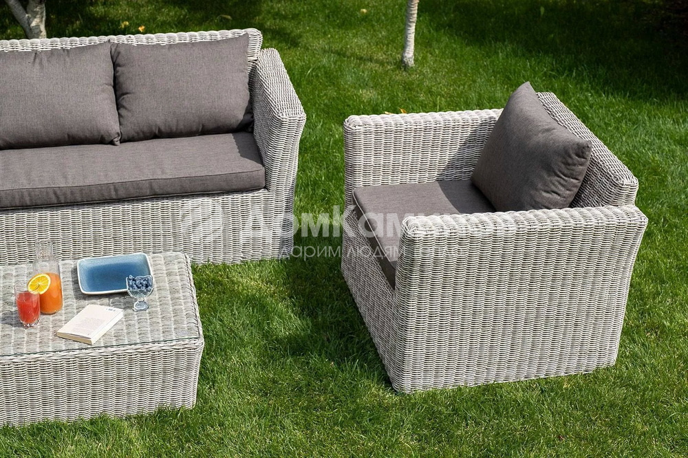 Кресла и диван идут в комплекте с подушками с серыми чехлами. Они пошиты из качественного полиэстера с плотностью 230гр/м2. Материал предварительно проходит обработку влагоотталкивающей пропиткой. Столик дополнен практичной столешницей из стекла толщиной 5 мм.