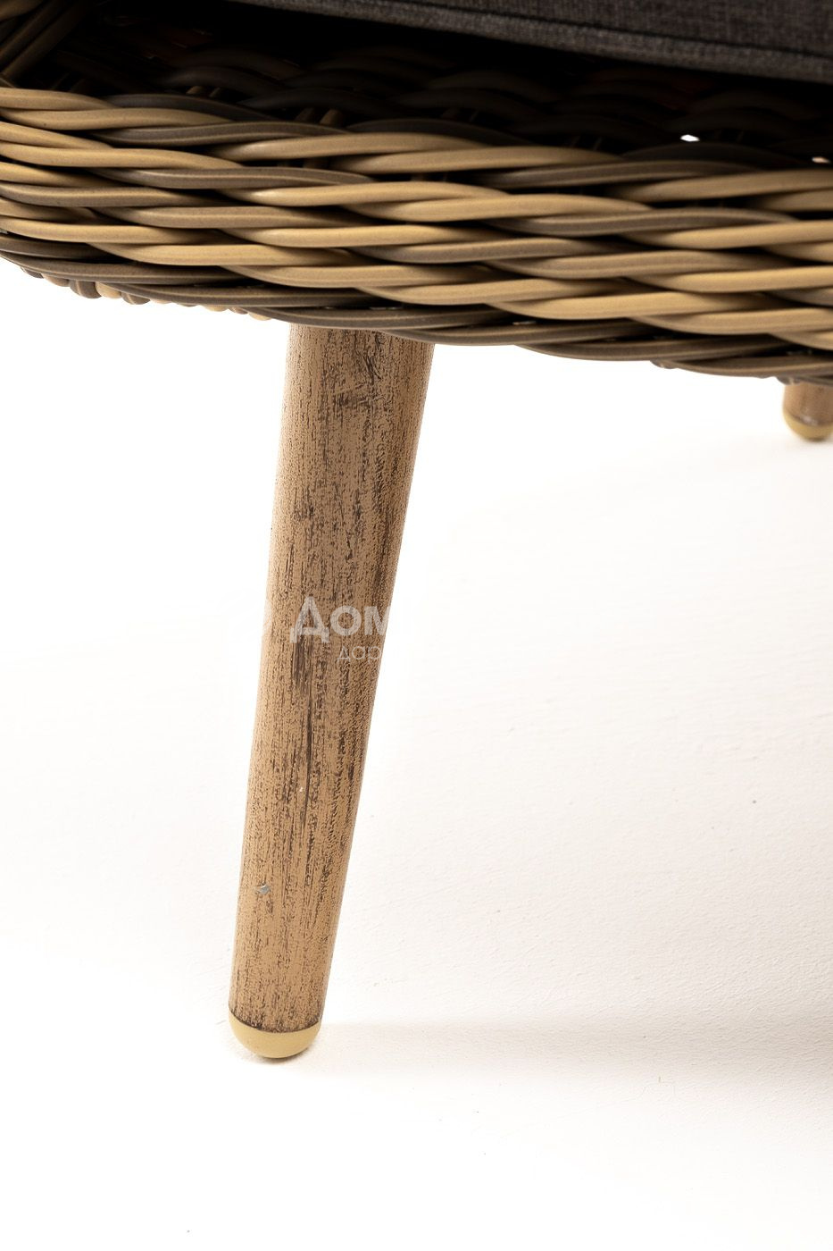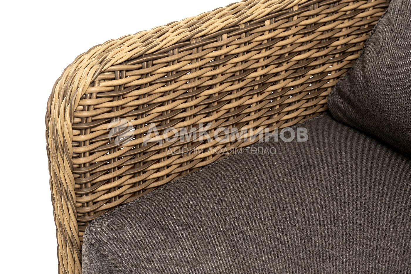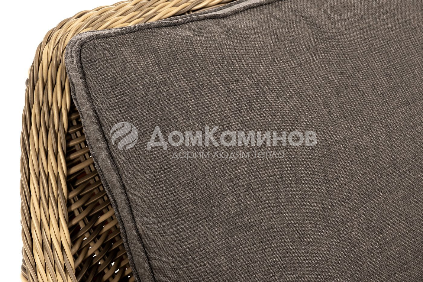 В комплекте с уличным ротанговым креслом идут мягкие подушки со съемными чехлами серо-коричневого оттенка. Они пошиты из полиэстера, который не боится повышенной влажности благодаря наличию влагоотталкивающей пропитки. Плотность ткани составляет 230гр/м2.