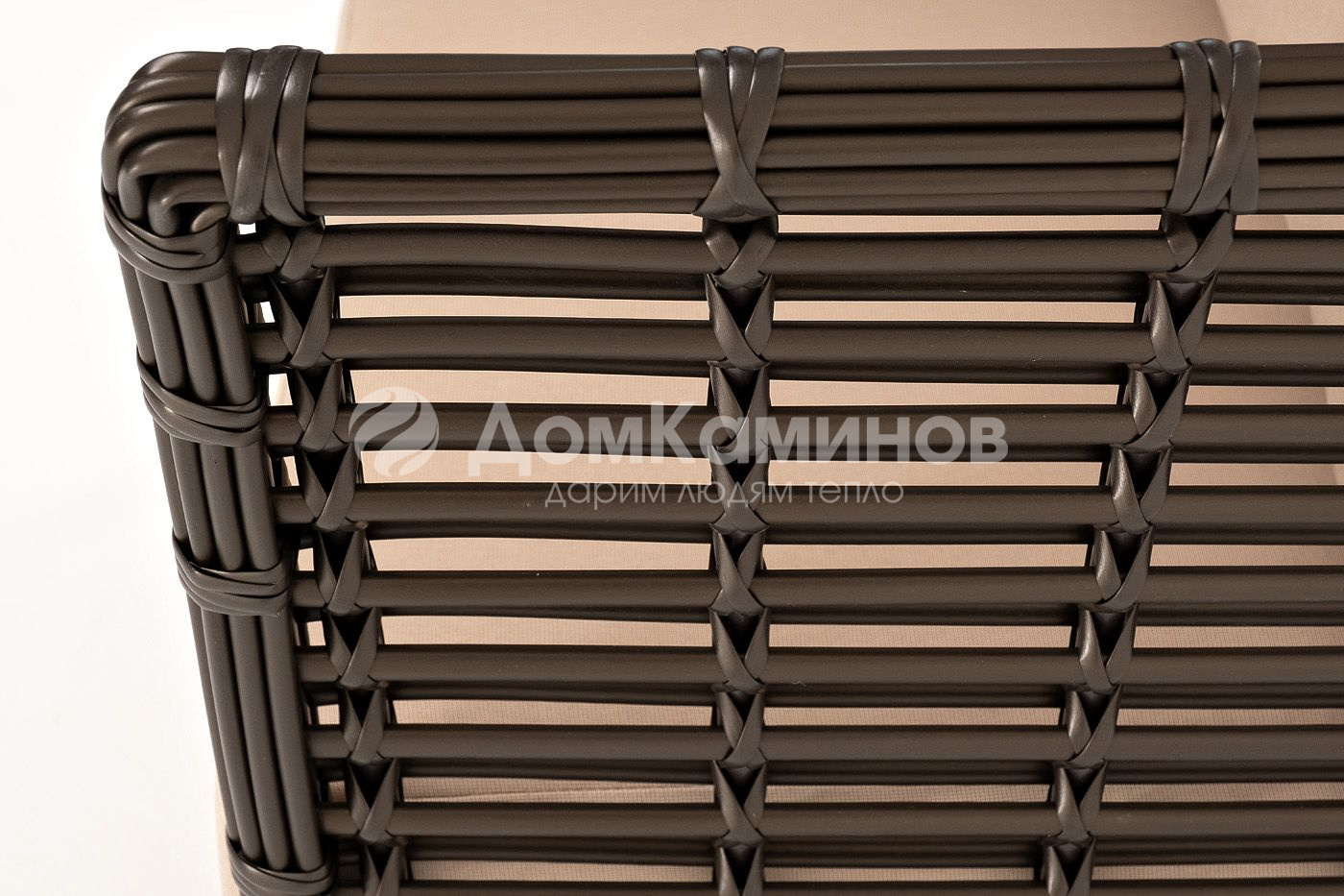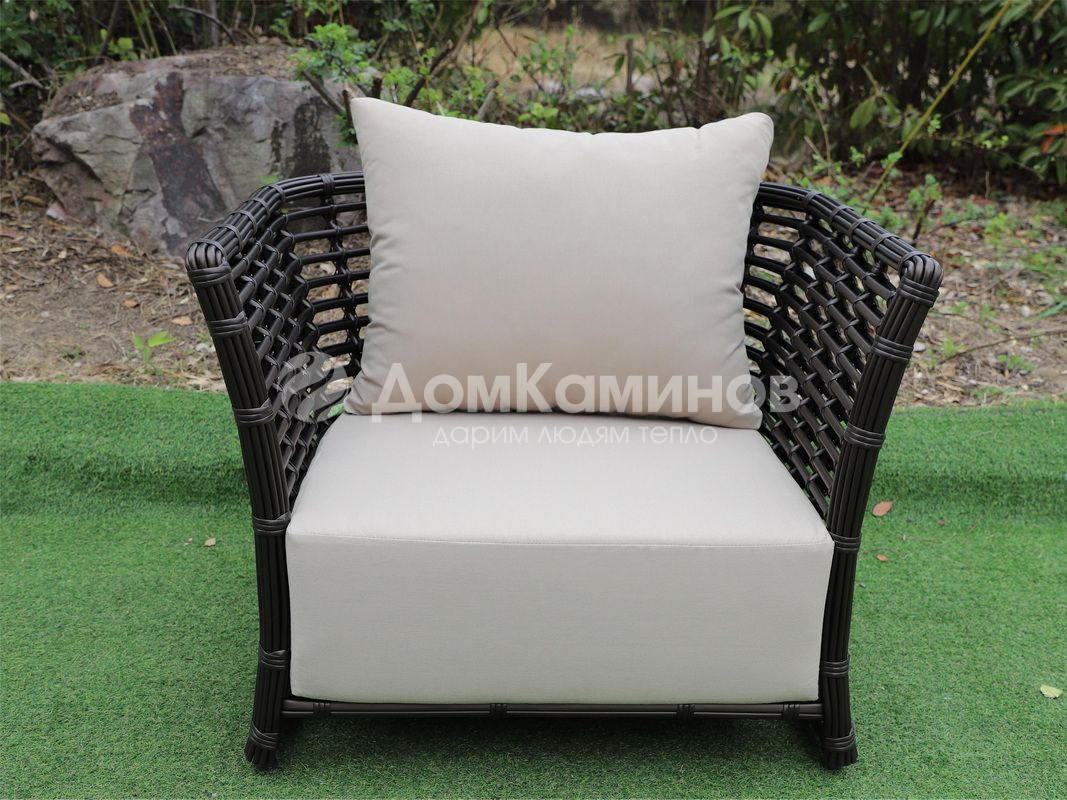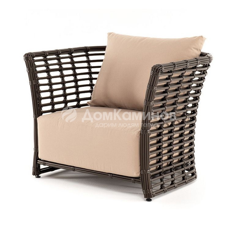 Кресло оснащено каркасом из прочного алюминия, ручное круглое плетение является основным декоративным элементом мебели. Оно выполнено из искусственного ротанга в бронзовом цвете.