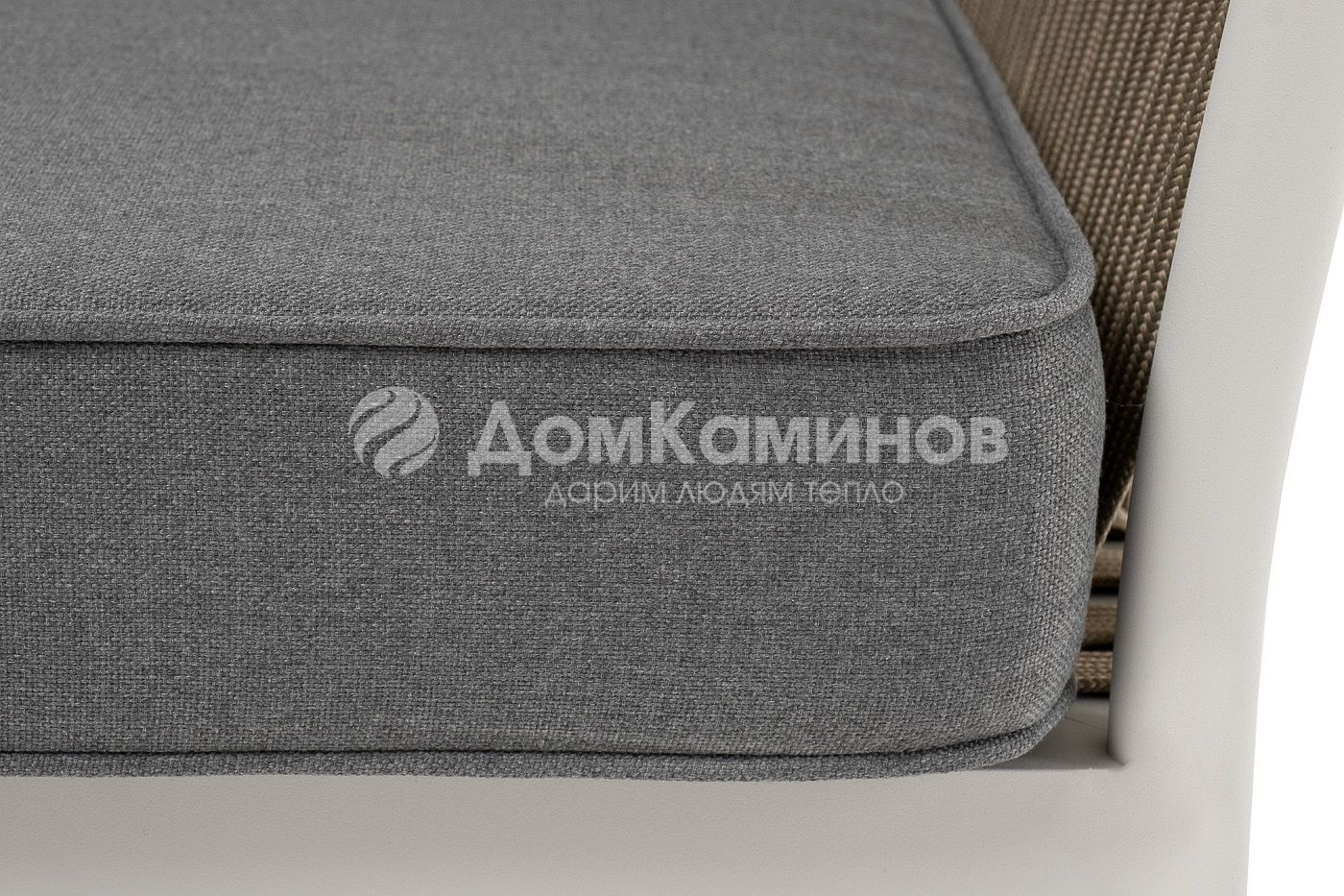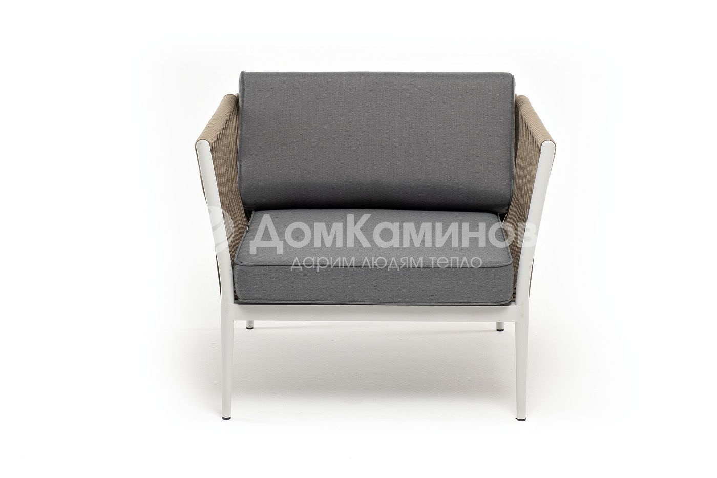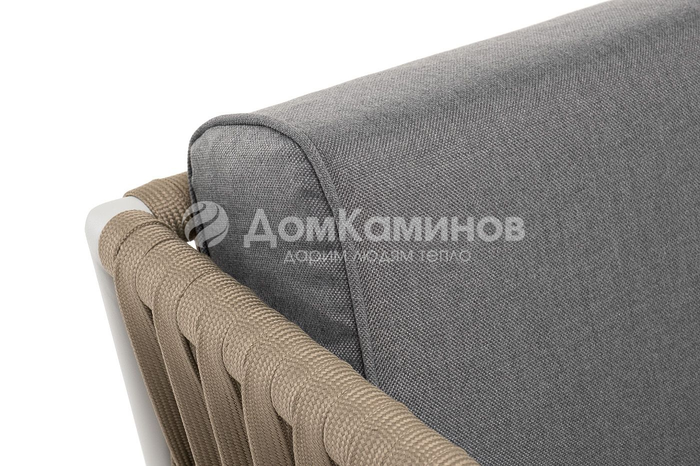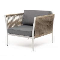 Плетеное кресло "Касабланка" с подушками в комплекте.Кресло имеет алюминиевый каркас, окрашенный порошковой краской в светло-серый (RAL7035) цвет. Боковины каркаса вручную оплетены роупом - эластичными синтетическими лентами, изготовленными из высокопрочных полиэфирных волокон. Цвет оплетки - серо-коричневый.Подушки со съёмными чехлами, которые обработаны влагоотталкивающей пропиткой. Материал - 100% полиэстер, плотностью 300гр/м2.Размер садового кресла: 900×800×695 мм.