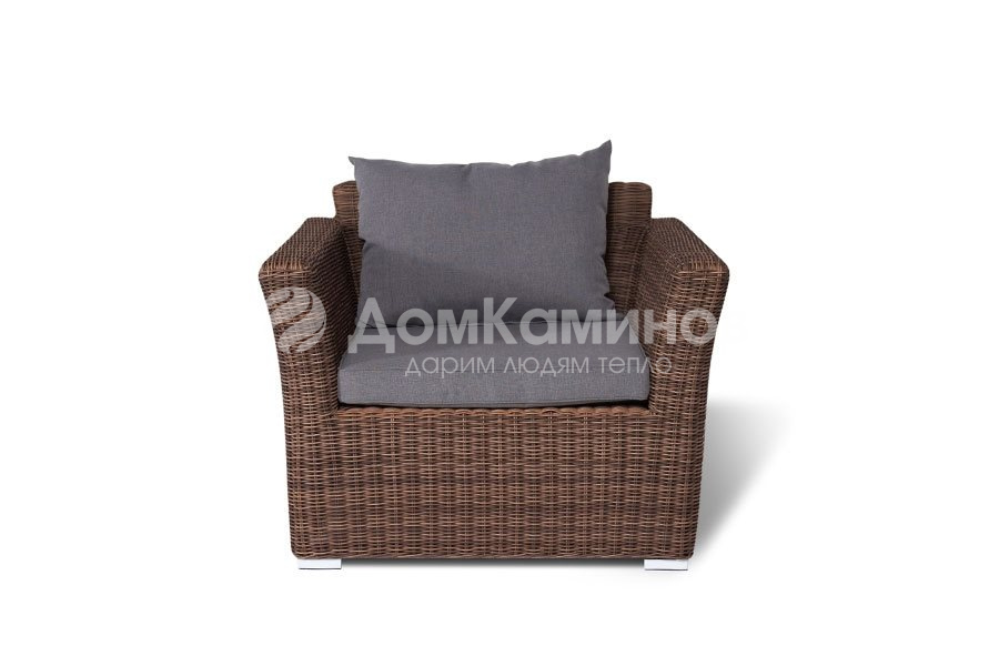 Кресло «Капучино» является практичным дополнением зоны отдыха, обустроенной мебелью из этой же серии. Размер модели – 1050 х 850 х 810 мм. Ее отличает алюминиевый каркас высокой прочности. В качестве декоративной составляющей выступает ручное плетение на основе искусственного ротанга. Оно выполнено в коричневом оттенке.