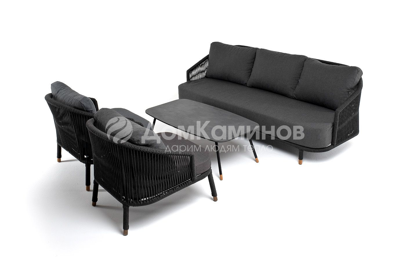 Кресла и диван идут в комплекте с мягкими подушками в чехлах темно-серого цвета.