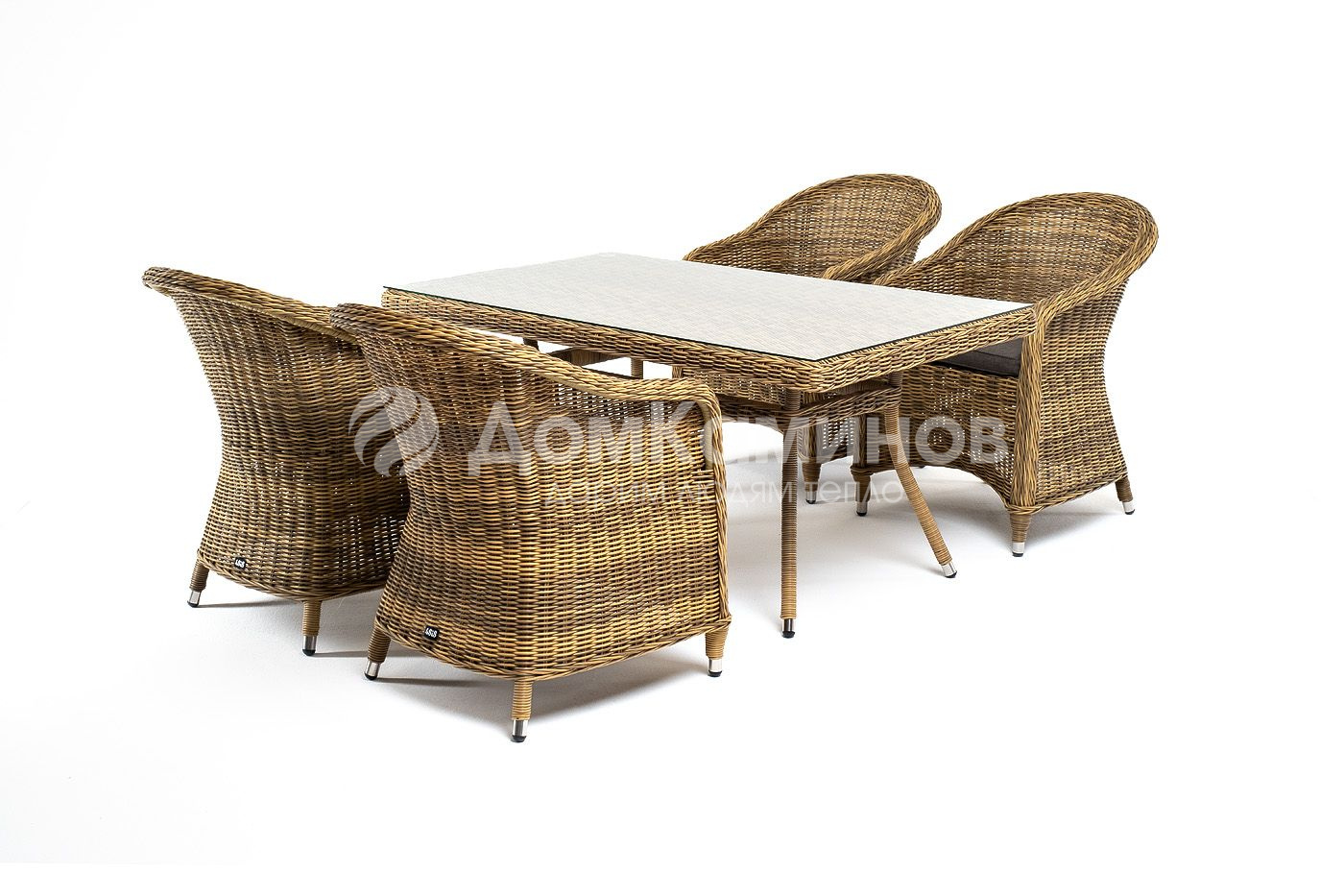 Ротанговая обеденная группа «Латте» со стульями из коллекции «Равенна».Набор состоит из прямоугольного стола со стеклянной столешницей, размером 1400х800х750 мм и 4 кресел, размером - 570×680×810 мм.Комплект гармонично сочетает в себе алюминий, из которого выполнен каркас и декор из искусственного ротанга соломенного цвета. Прекрасным дополнением мебели стали мягкие подушки из всепогодной ткани со съемными чехлами.Вы можете приобрести каждый из элементов набора отдельно, чтобы оборудовать лаунж-зону нужного вам размера.