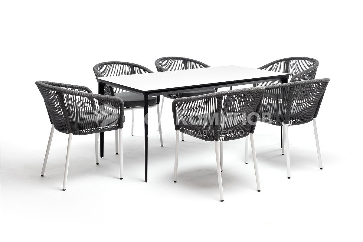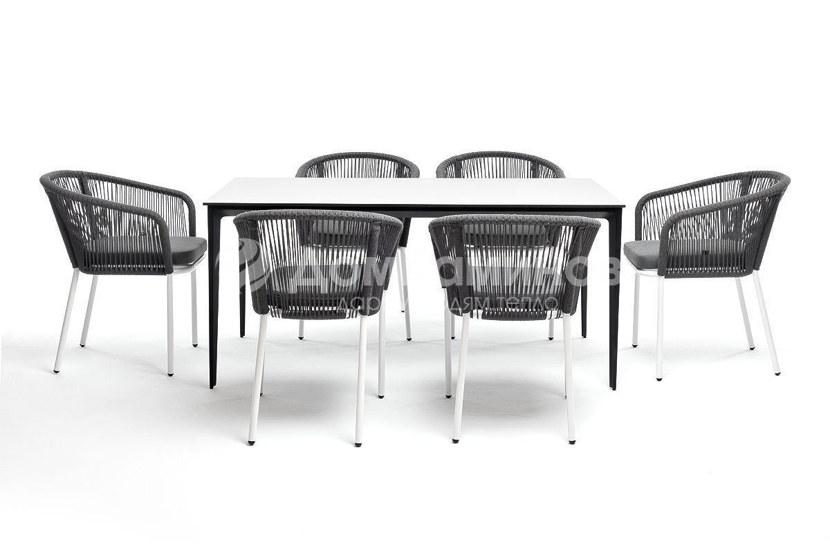 Обеденная группа «Венето» рассчитана на 6 персон.В состав комплекта входит:- Стол "Венето" со столешницей из HPL-пластика, размер столешницы - 1600х800 мм, цвет - "серый гранит". Высота стола - 750 мм- 6 плетеных стульев "Марсель" из роупа, размером - 570х620х800 мм, цвет роупа - темно-серый, каркас из алюминия, окрашен порошковой краской в темно-серый оттенок.