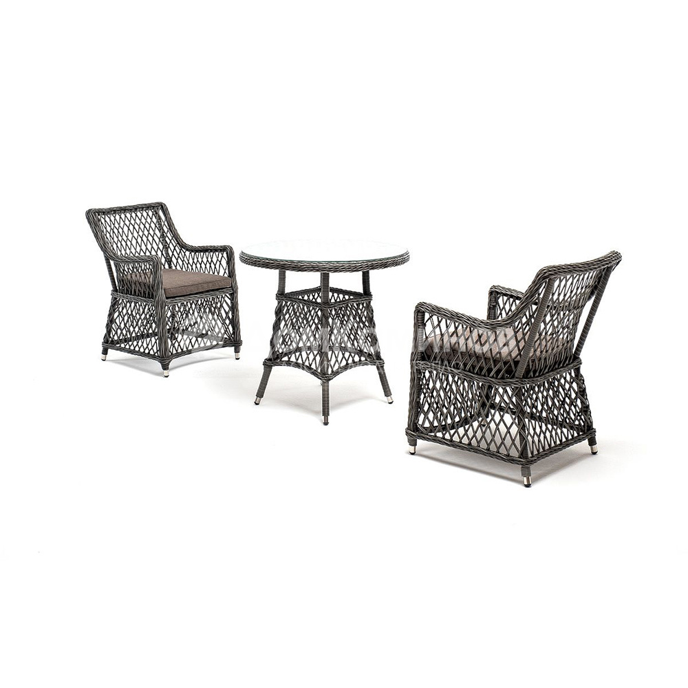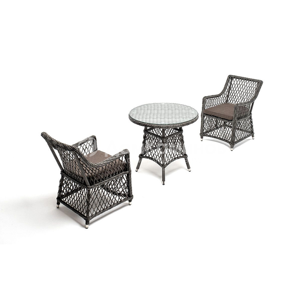 Комплект "Эспрессо-80 L" можно использовать в качестве обеденной группы на 2 персоны или как кофейный комплект на балконе или террасе.В плетеный комплект входит круглый стол «Эспрессо» диаметром 80 см с ударопрочной стеклянной столешницей и 2 кресла коллекции «Латте» 550×680×840 мм.Набор представлен в графитовом цвете.