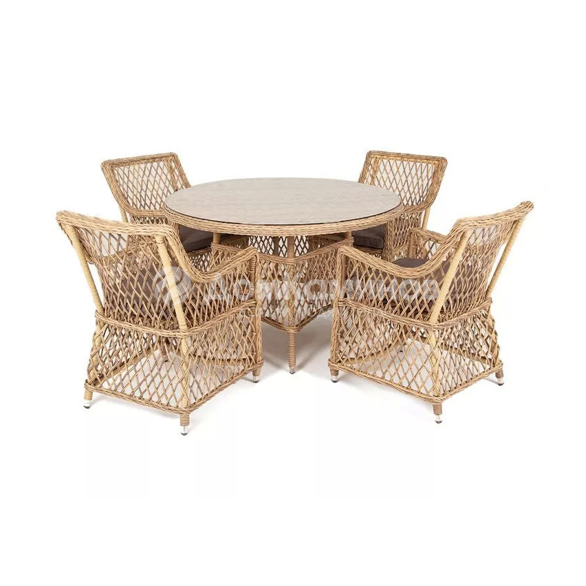 Классическая уличная обеденная группа "Доппио" для сада, летней веранды ресторана. В комплекте круглый обеденный стол «Эспрессо» (1180×1180×750 мм) с ударопрочной стеклянной столешницей и 4 кресла коллекции «Латте» 680х550х840 мм.Каркас мебели выполнен из прочного и легкого алюминия, вручную оплетенного круглым синтетическим ротангом натурального соломенного оттенка. На креслах предусмотрены мягкие подушки со съемными чехлами темно-серого цвета.Вы также можете приобрести каждый из элементов по отдельности для создания нужного вам количества посадочных мест и дизайна.