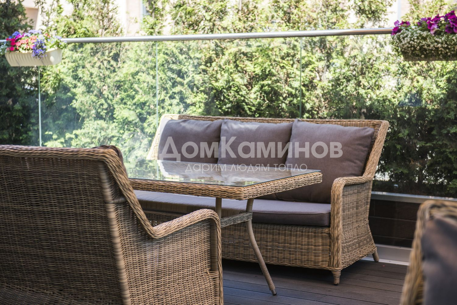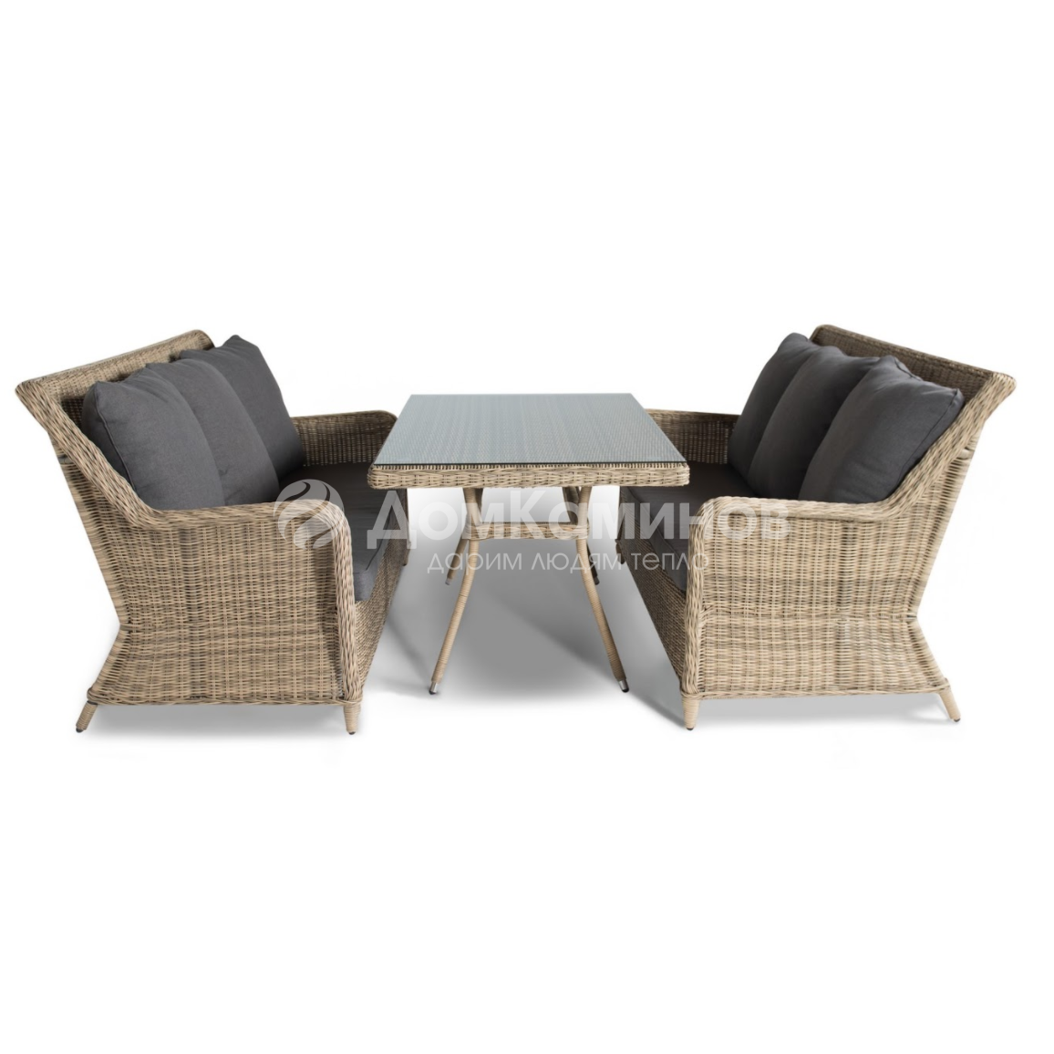 Обеденная группа Кортадо из искусственного ротанга: 2 трехместных дивана, обеденный стол со стеклянной столешницей.