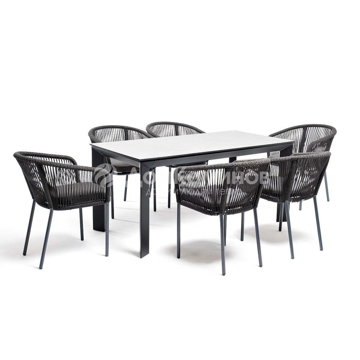 Обеденная группа «Венето» рассчитана на 6 персон.В состав комплекта входит:- Стол "Венето" со столешницей из HPL-пластика, размер столешницы - 1600х800 мм, цвет - "серый гранит". Высота стола - 750 мм- 6 плетеных стульев "Марсель" из роупа, размером - 570х620х800 мм, цвет роупа - темно-серый, каркас из алюминия, окрашен порошковой краской в темно-серый оттенок.