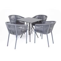 4 кресла из коллекции «Бордо», выполненных из алюминиевого каркаса и ручной оплетки роупом. Это эластичные синтетические ленты из высокопрочных полиэфирных волокон, представлены в сером цвете.