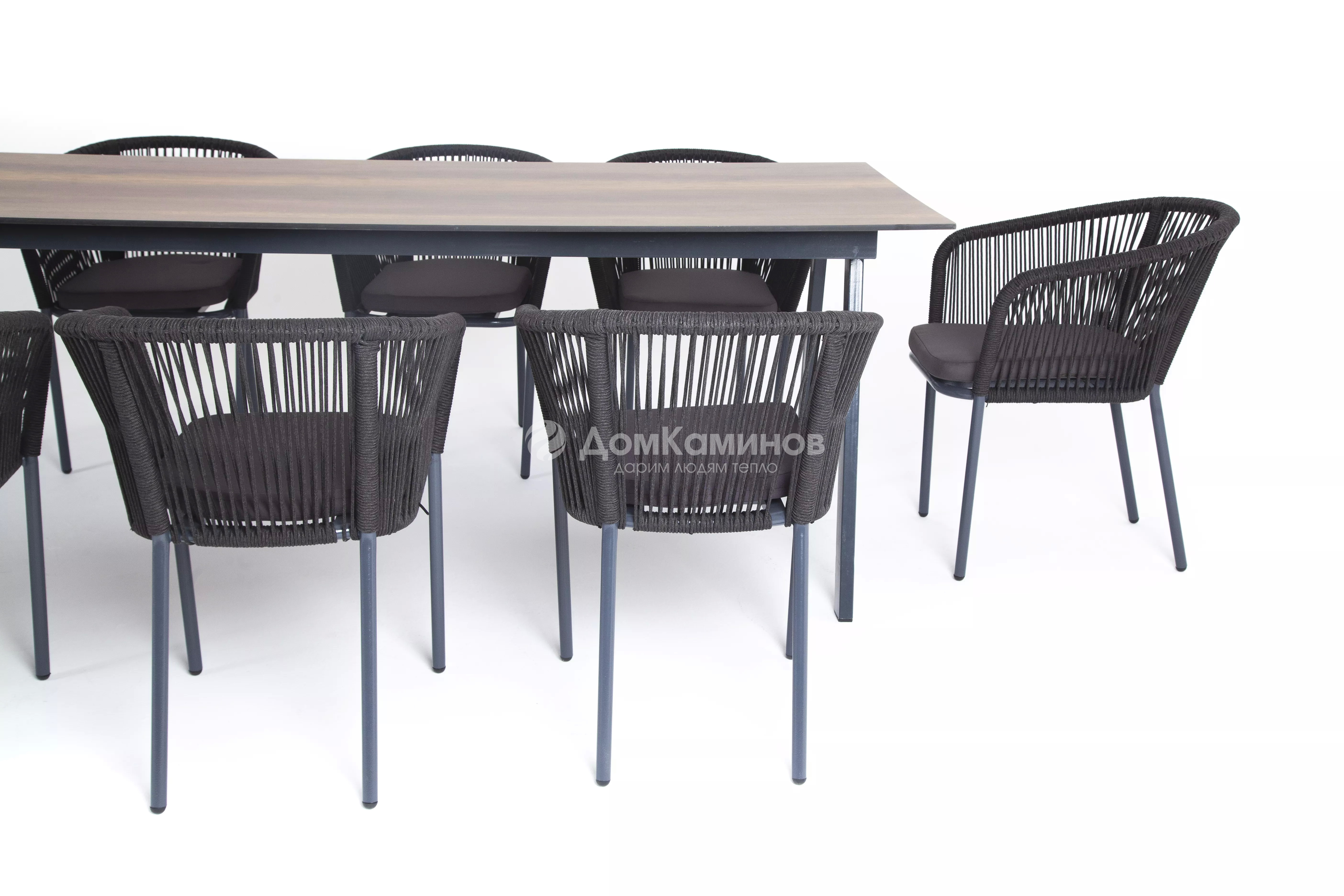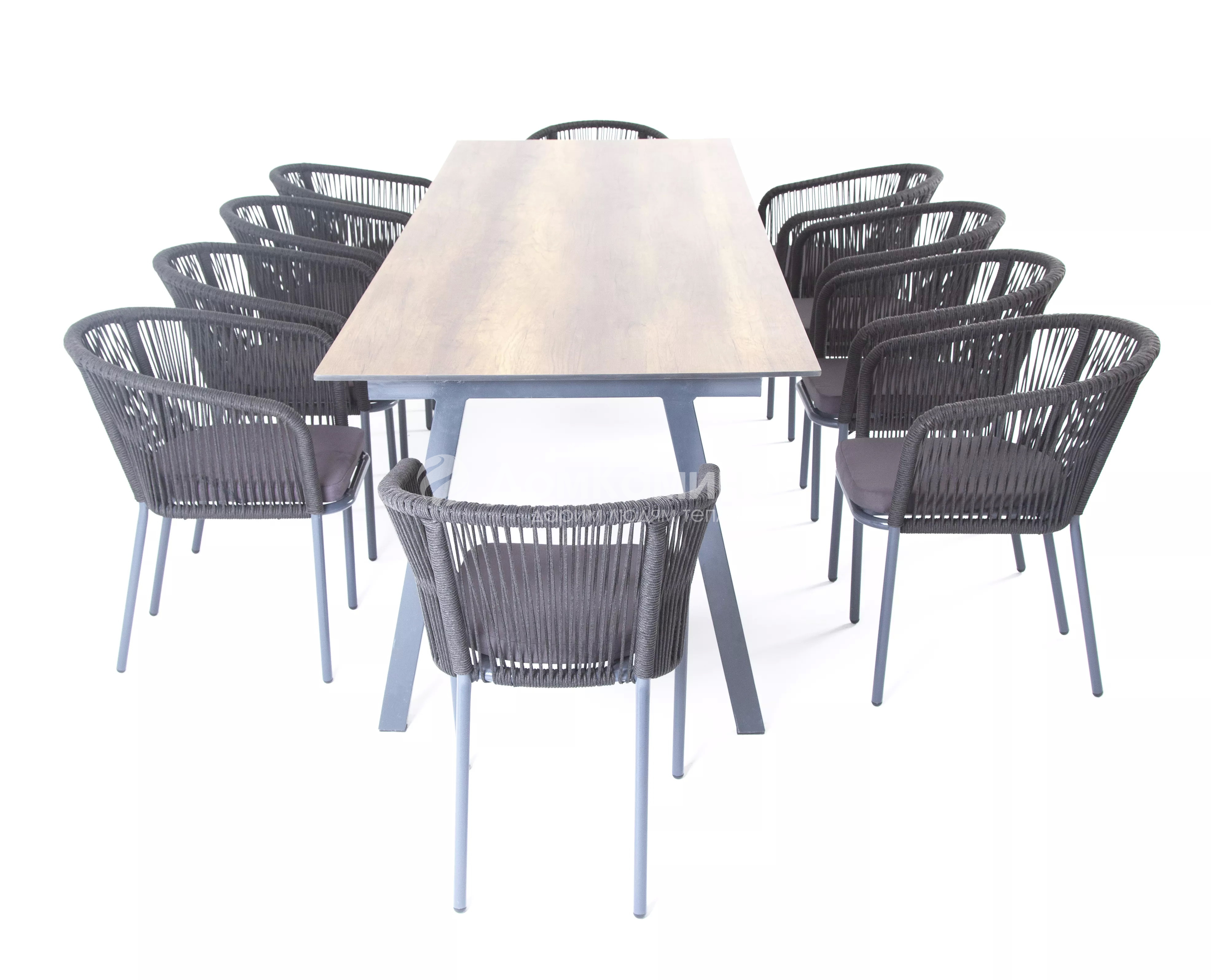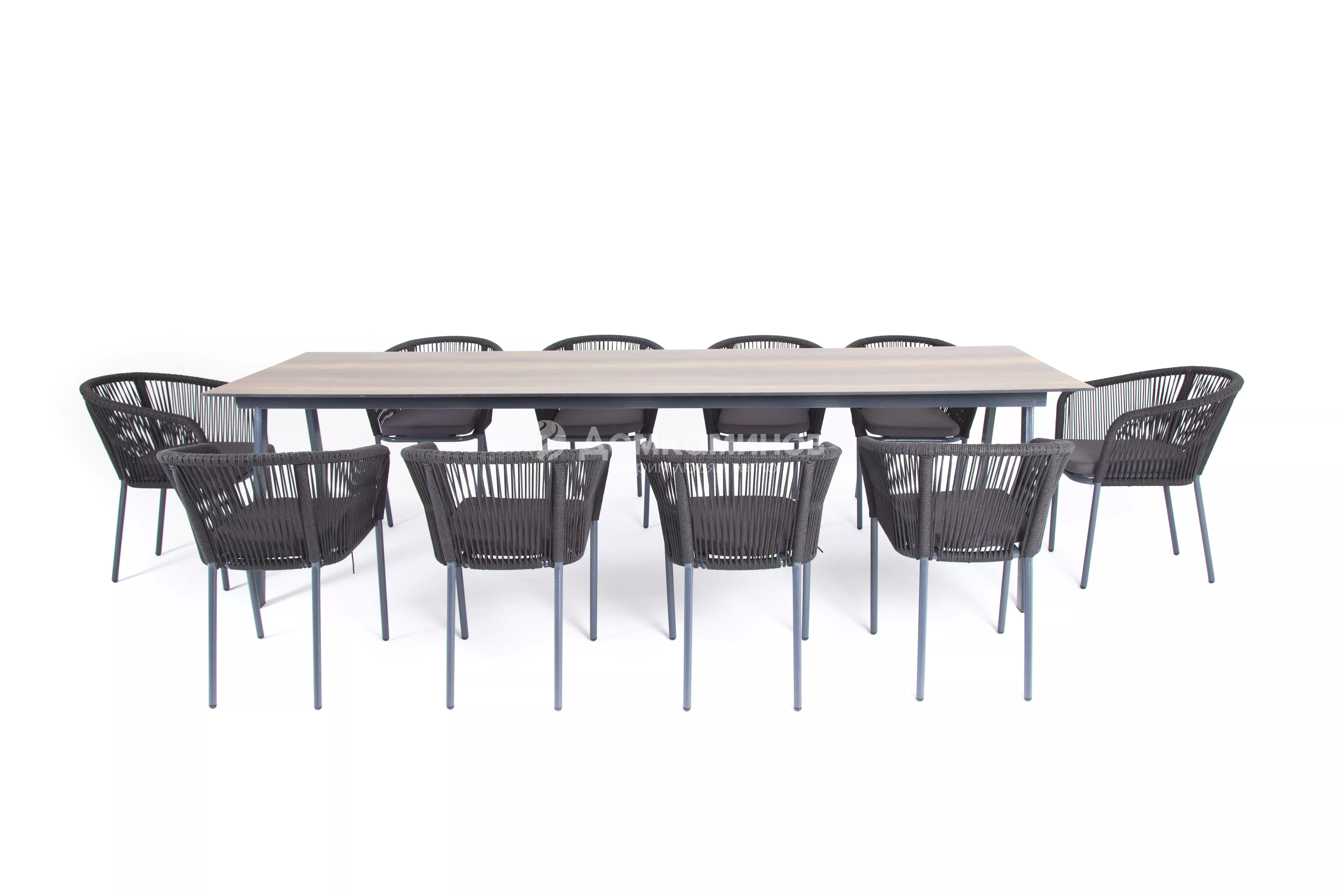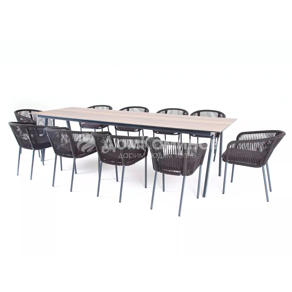 Обеденная группа «Куба» рассчитана на 10 персон.В состав комплекта входит:- Стол обеденный 300 х100 см, цвет дуб- 10 плетеных стульев "Марсель" из эластичных лент, размером - 570X620X800 мм, цвет темно-серый