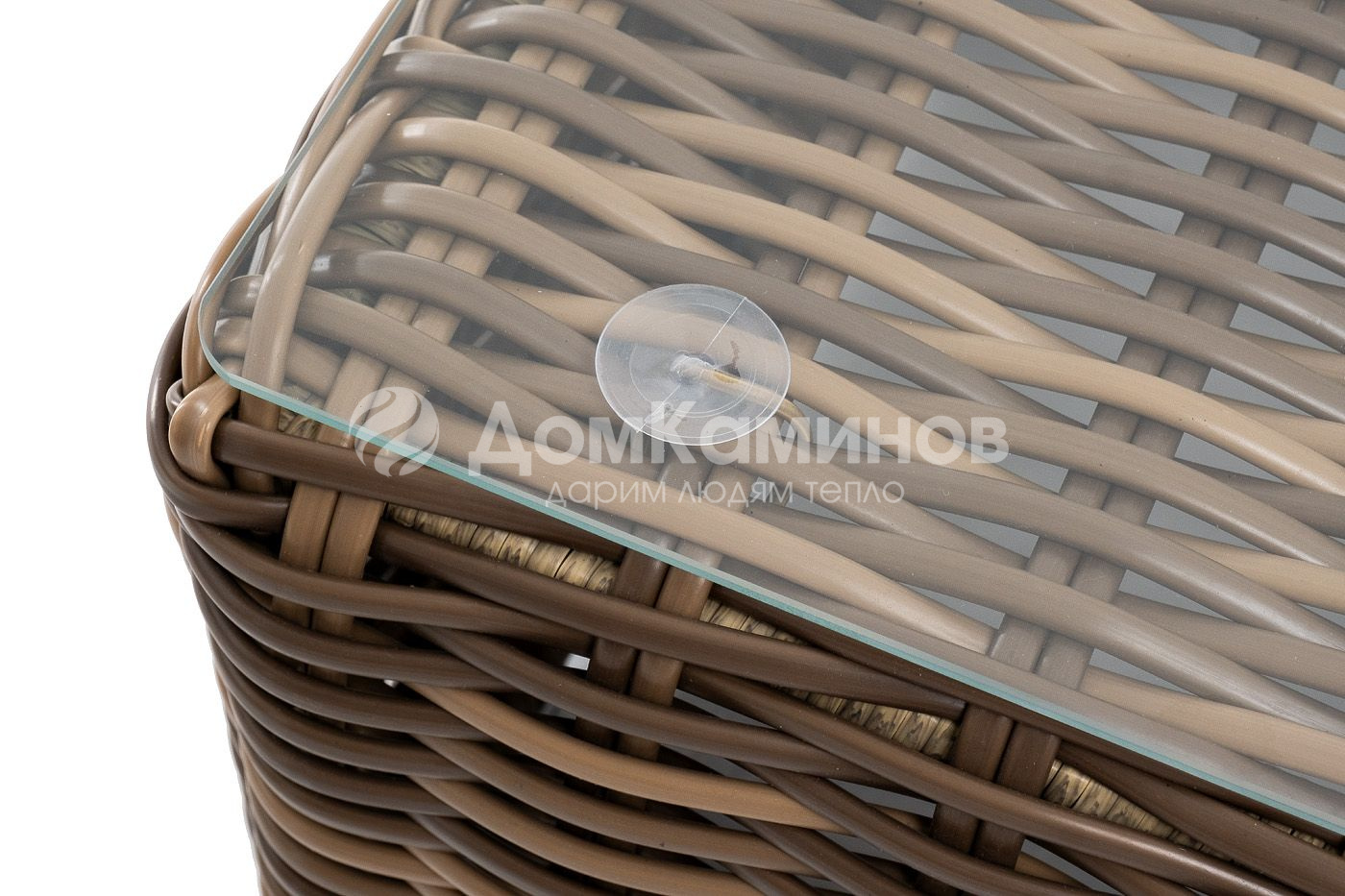Каркас столика изготовлен из алюминия, вручную оплетенного круглым искусственным ротангом.