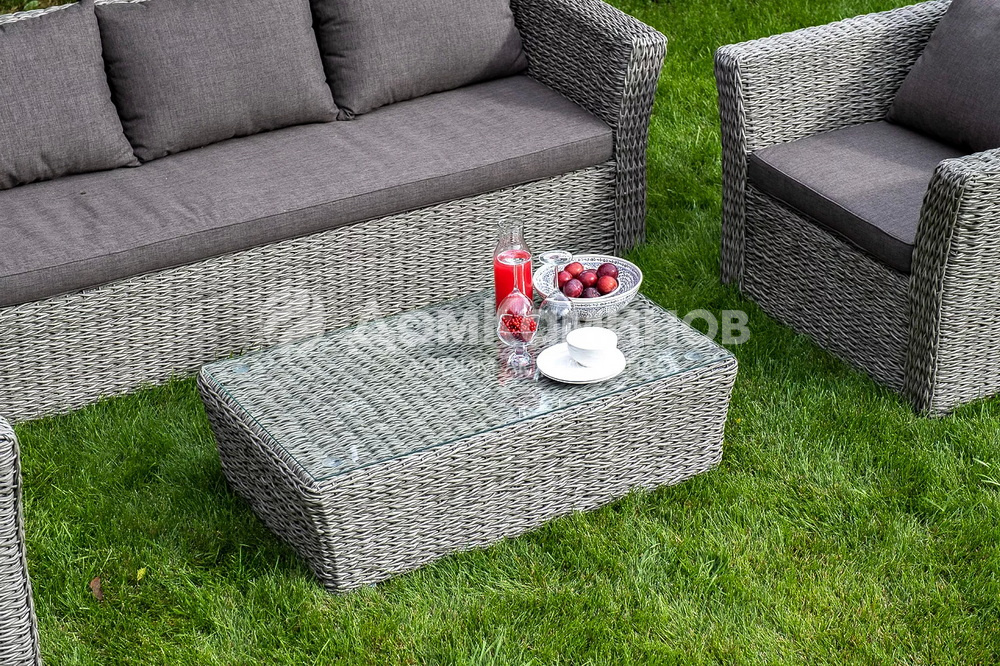 Журнальный столик «Капучино» из искусственного ротанга вида "гиацинт" графитового оттенка обладает прочным каркасом, изготовленным из алюминия, оплетка которого произведена ручным способом. Поверхность защищена столешницей из 5мм стекла.