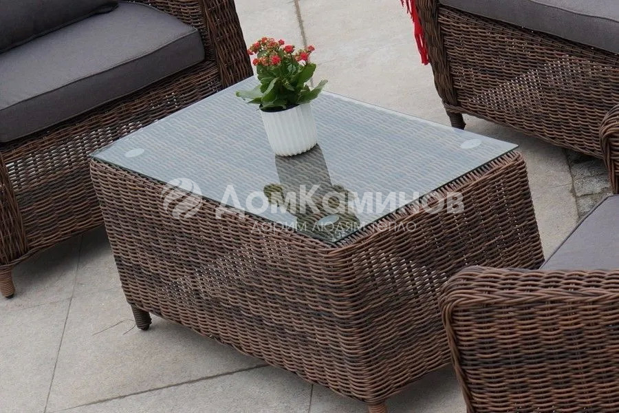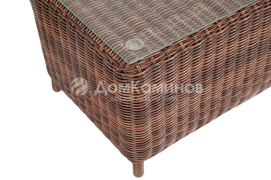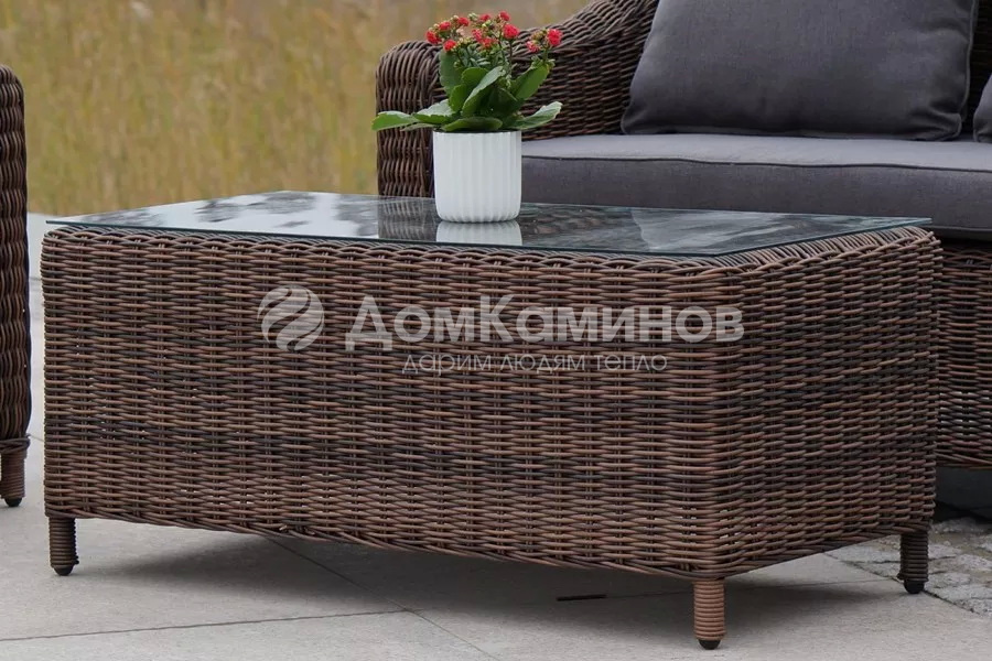 Журнальный столик из искусственного ротанга «Кон Панна» коричневого цвета, подходит для эксплуатации при различных погодных условиях. Модель оснащена прочным каркасом, изготовленным из алюминия. В качестве столешницы используется ударопрочное стекло толщиной 5мм.