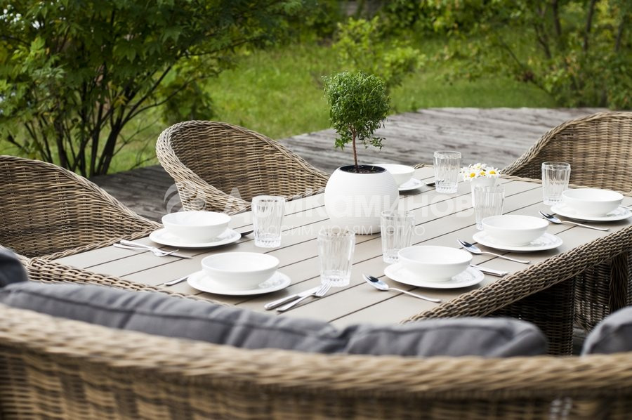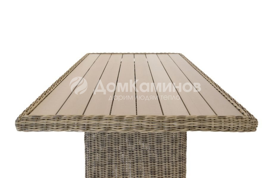 Обеденный стол Бергамо из искусственного ротанга, который прекрасно сочетается с трансформирующейся мягкой зоной Бергамо. Стол переплетен искусственным ротангом, известным своей долговечностью. Фактура столешницы выполнена под дерево (ДПК), с торца оплетена искусственным ротангом и легка в эксплуатации.