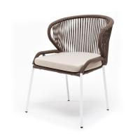 Стул «Милан» для обустройства обеденной или лаунж-зоны.Изготовлен из алюминиевого каркаса белого цвета, оплетенного вручную эластичными синтетическими лентами из высокопрочных полиэфирных волокон (роуп круглый). Цвет оплетки - коричневый.В комплект входит подушка со съёмным чехлом из 100%-го полиэстера с влагоотталкивающей пропиткой бежевого цвета.Размеры плетеного стула: 600×660×795 мм.